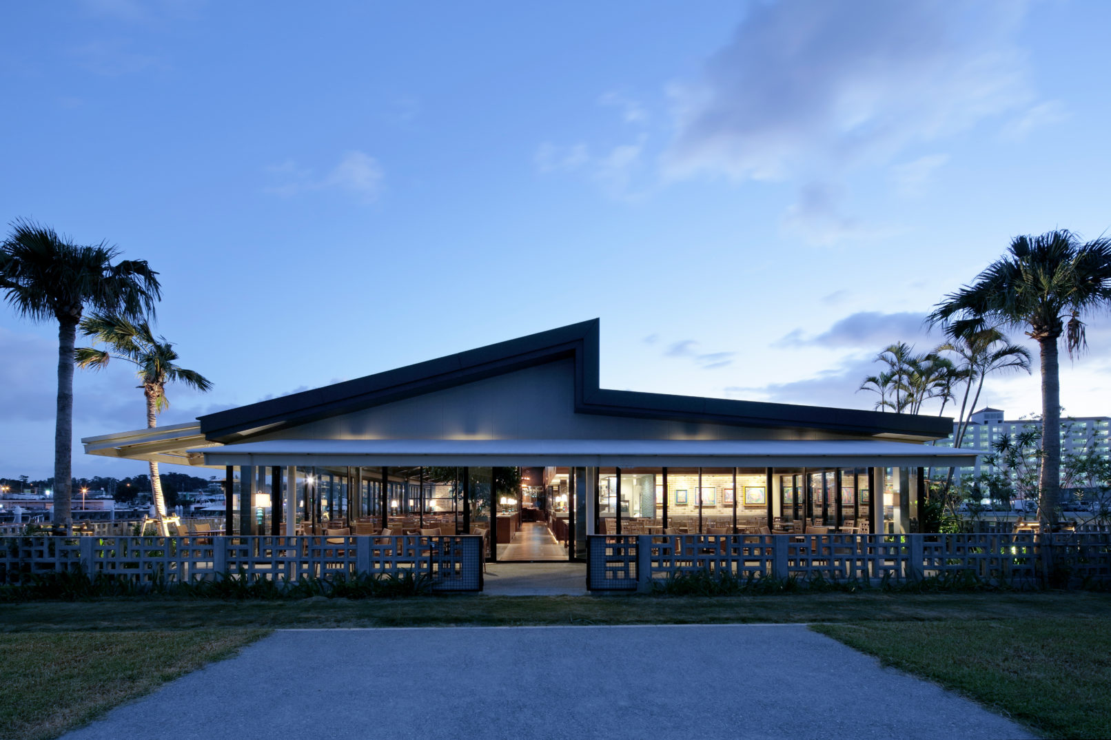 沖縄本島中部に位置する、クラフトビールの製造工場+レストランバーの計画。工場の機能性と経済性から成立した倉庫型のボリュームに、食事や憩いのための“居心地”を付加すべく、風土や文化、環境要素(光・風・熱・水)を丁寧に読み解いて設計をした。沖縄らしい縁側的居場所をつくり、強烈な陽射しをカットし快適な明るさ、風を室内にもたらすガイドとなるべく“庇”を設ける。縁側的居場所の領域を形成する“塀”は現地に見られる風を通すブロックを組石することで海からの強い風(時に台風)を段階的に弱めて心地よい風として室内に取り込む。自然に誰もが享受する環境要素、古くからその地に伝わる技術や習慣、海辺に見る情景的な風景、そして生身の身体が感じる居心地の良さを意識の上で設計をした。