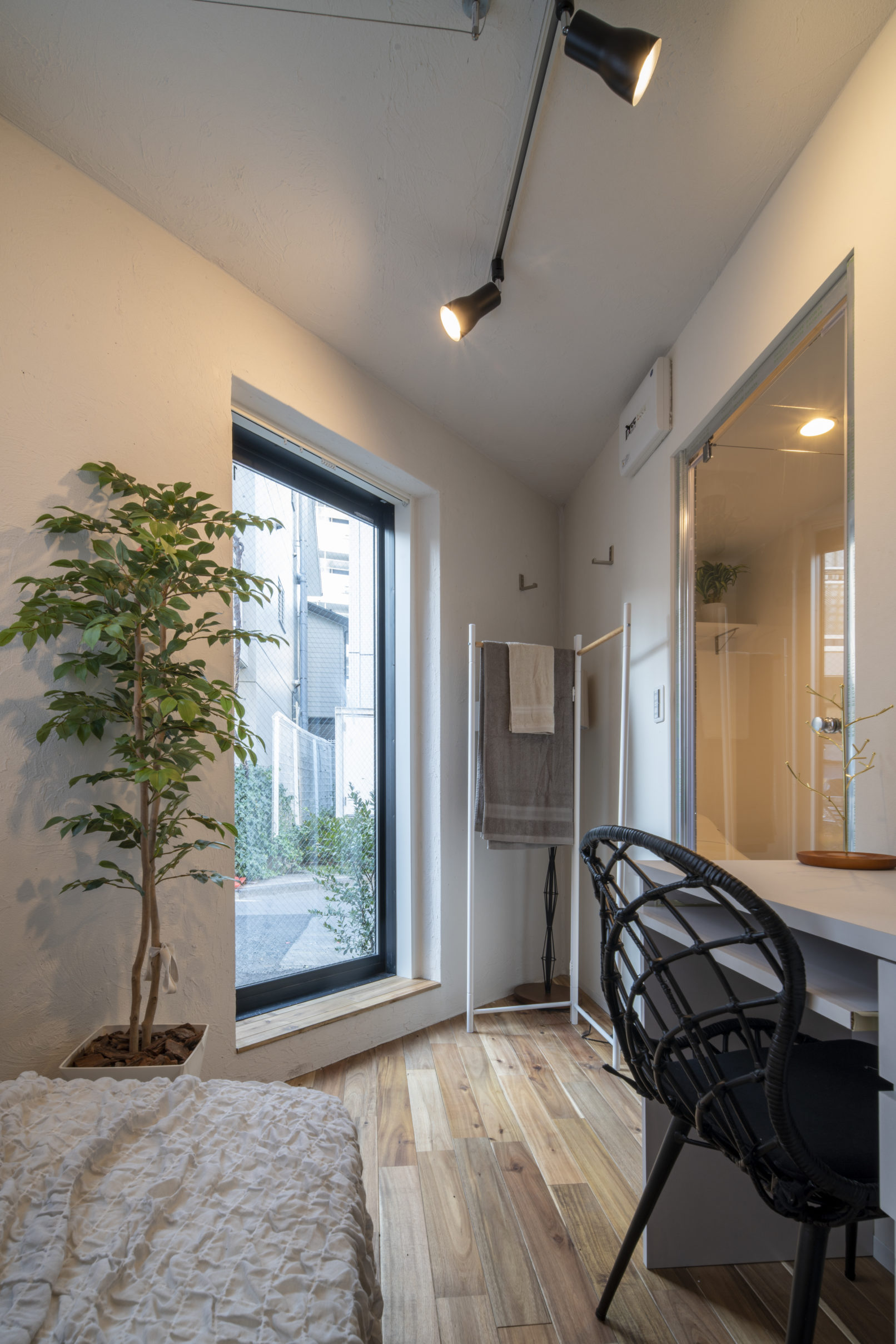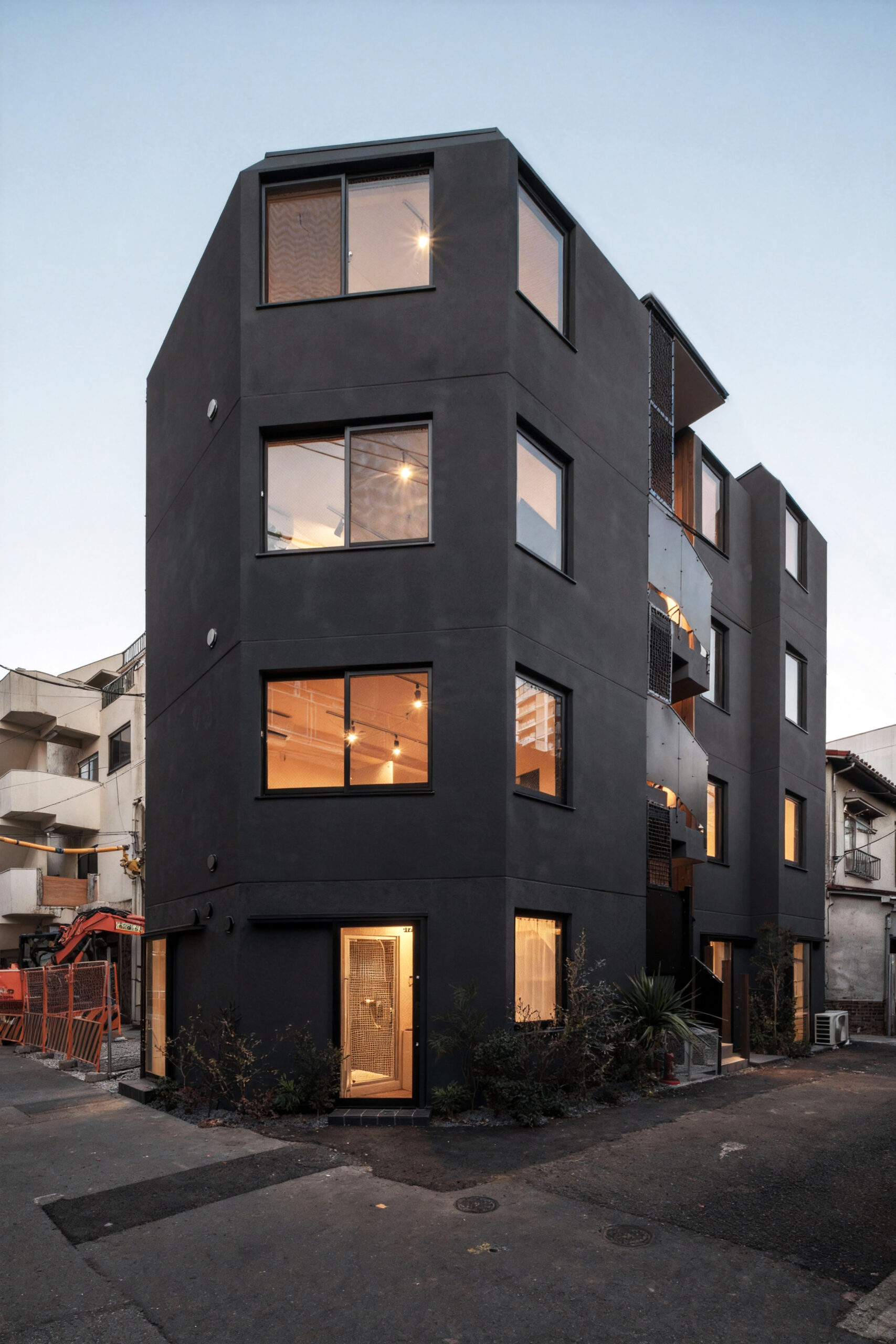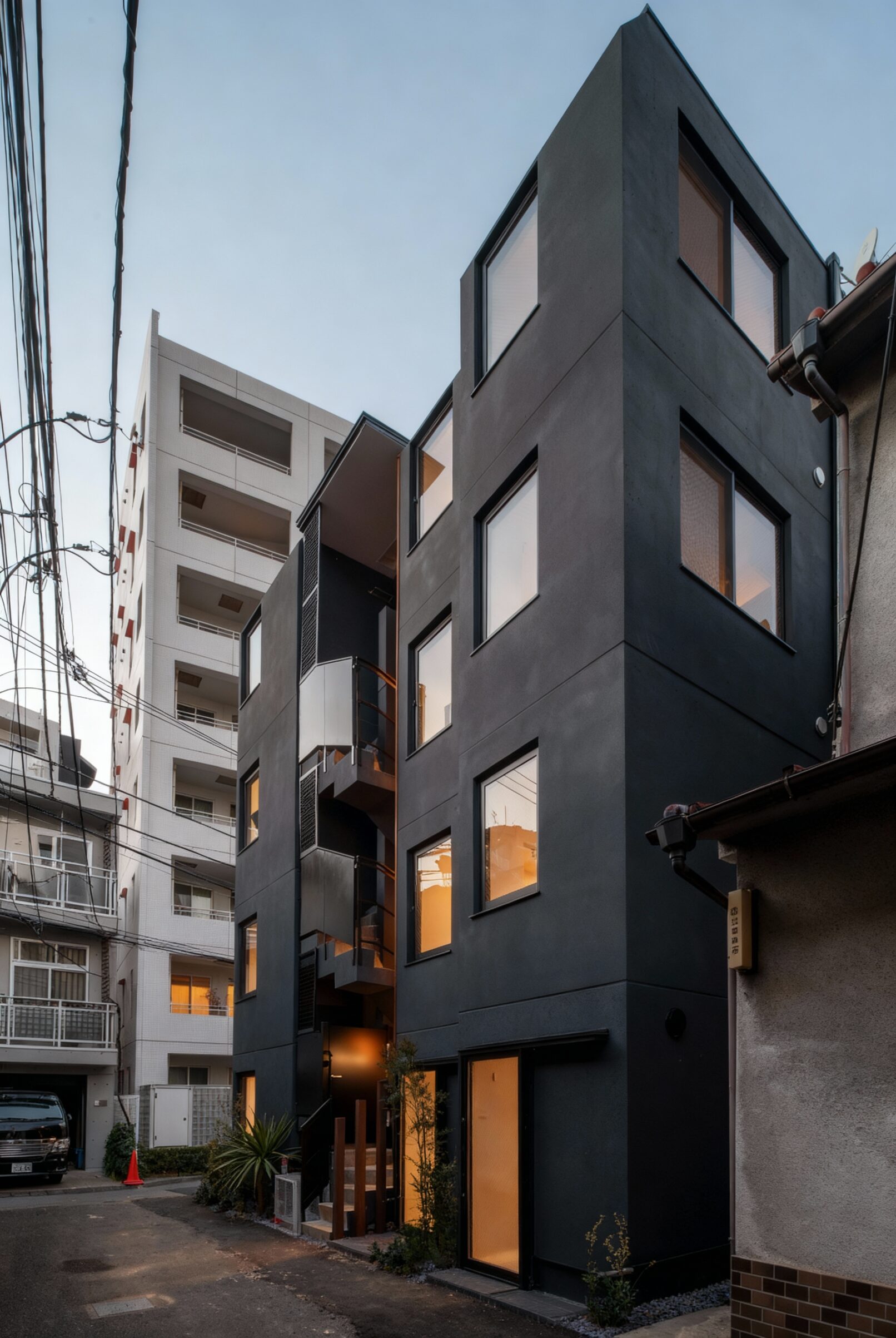 4層を10Mに抑えた都市型RC集合住宅のプロトタイプ。建築面積40㎡ほどの小さなフットプリントに計10戸の住戸が入る。2-4階は1層2住戸のワンルーム形式。1階に水回りやキッチンなどを最小限に抑えた10㎡の住戸が4つ並ぶ。食事や団らんや大きなお風呂は外で済ませば良いというような、東京の一等地における新しい生活スタイルの実験的提案である。