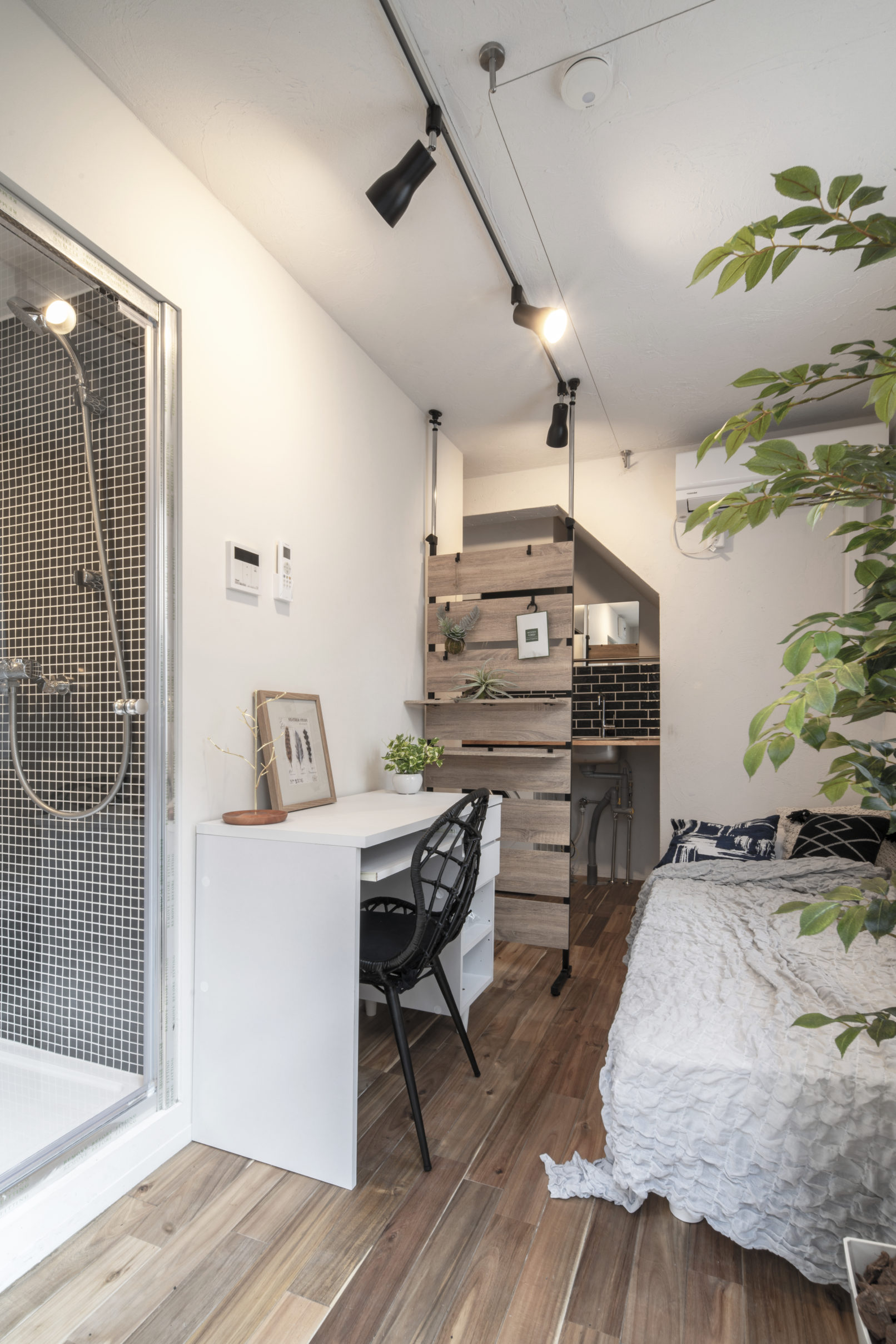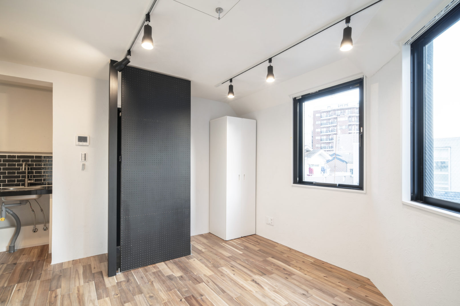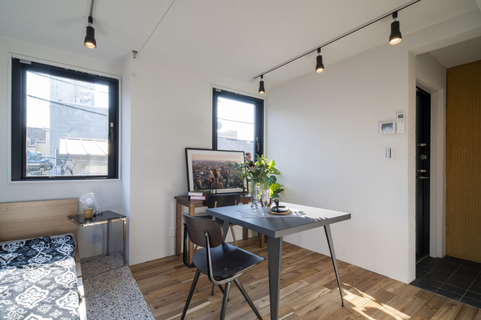 4層を10Mに抑えた都市型RC集合住宅のプロトタイプ。建築面積40㎡ほどの小さなフットプリントに計10戸の住戸が入る。2-4階は1層2住戸のワンルーム形式。1階に水回りやキッチンなどを最小限に抑えた10㎡の住戸が4つ並ぶ。食事や団らんや大きなお風呂は外で済ませば良いというような、東京の一等地における新しい生活スタイルの実験的提案である。