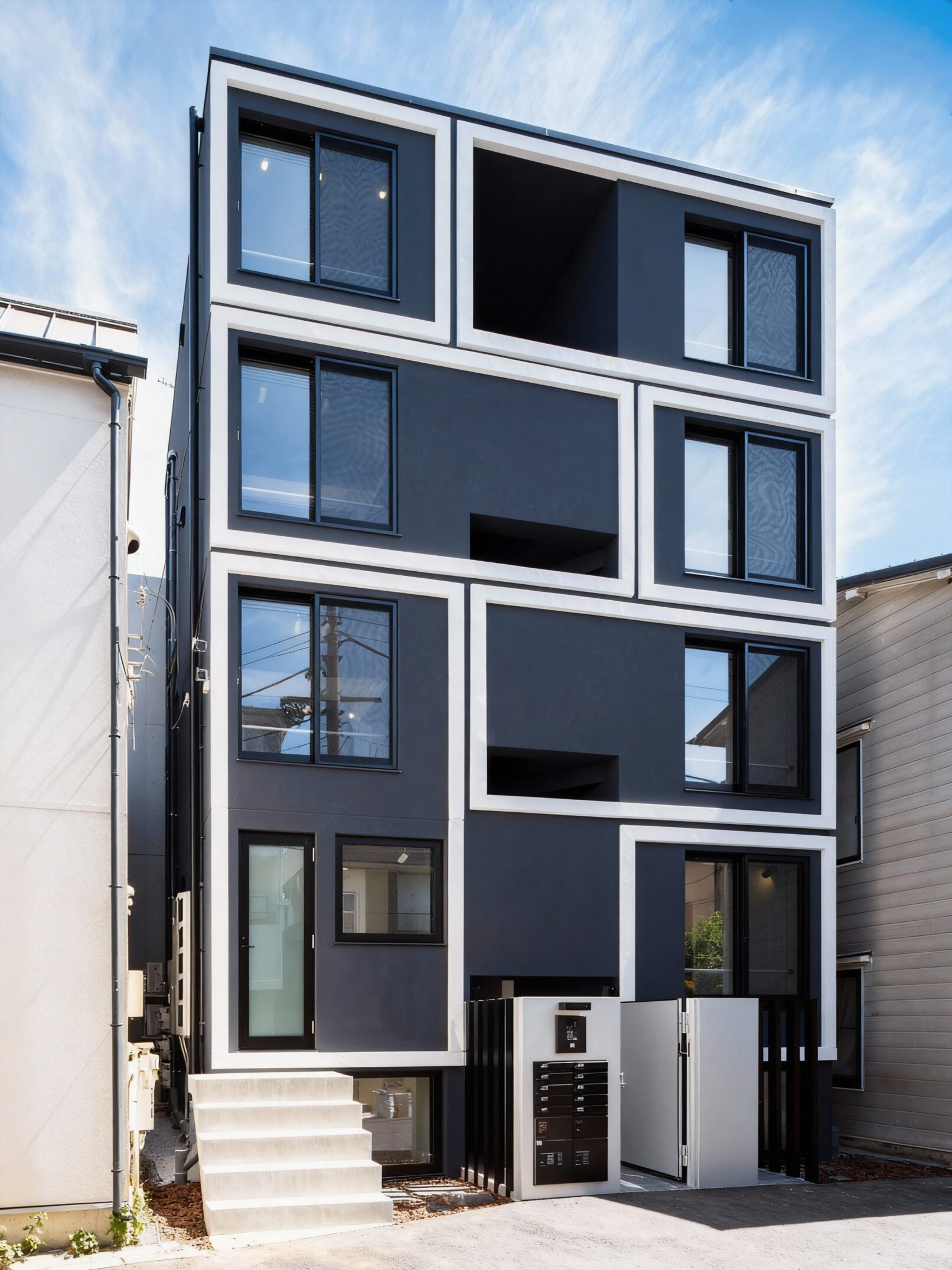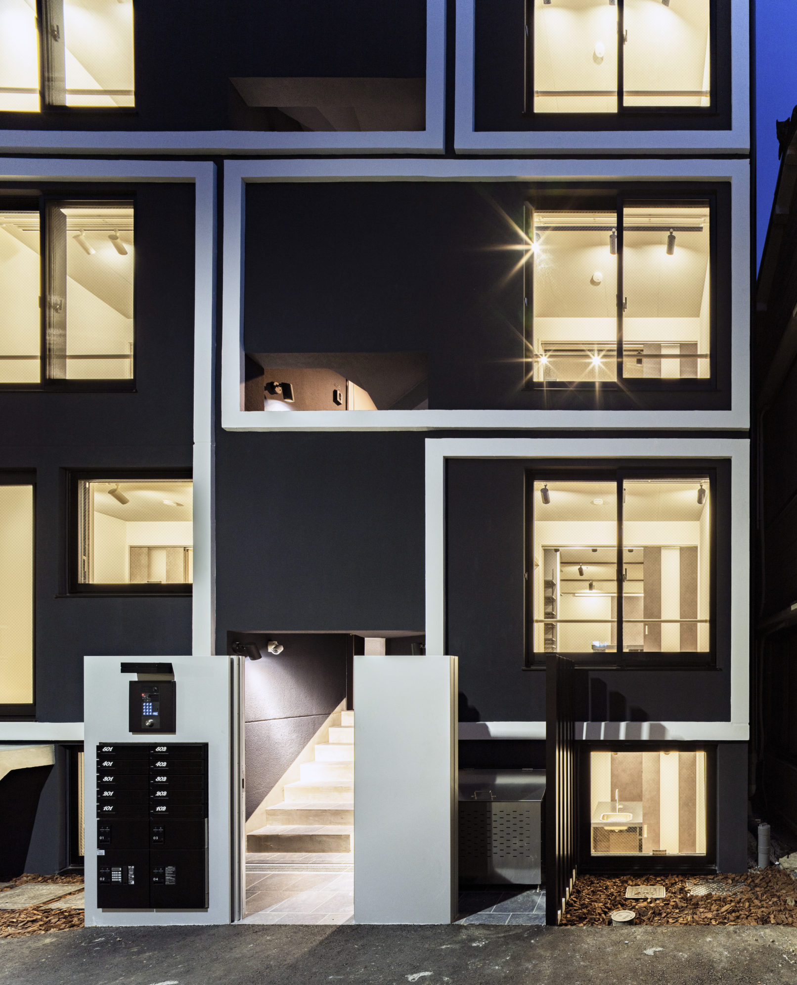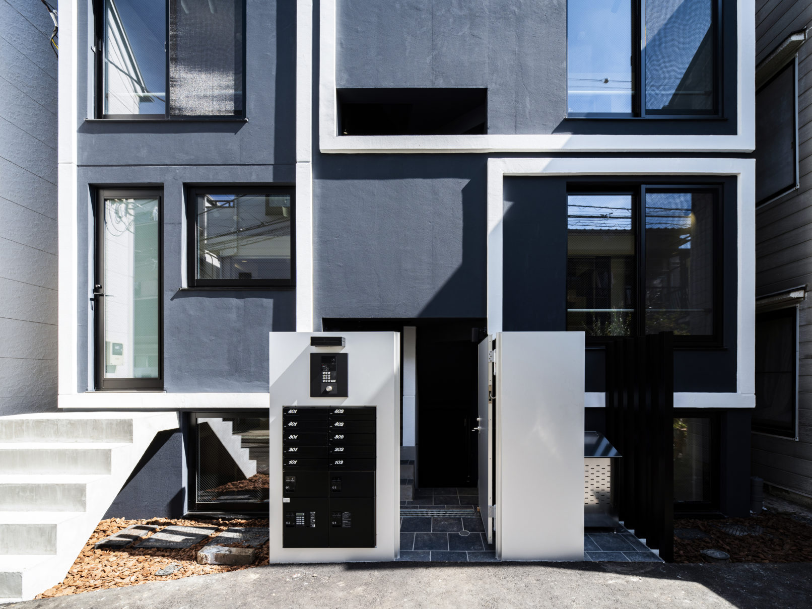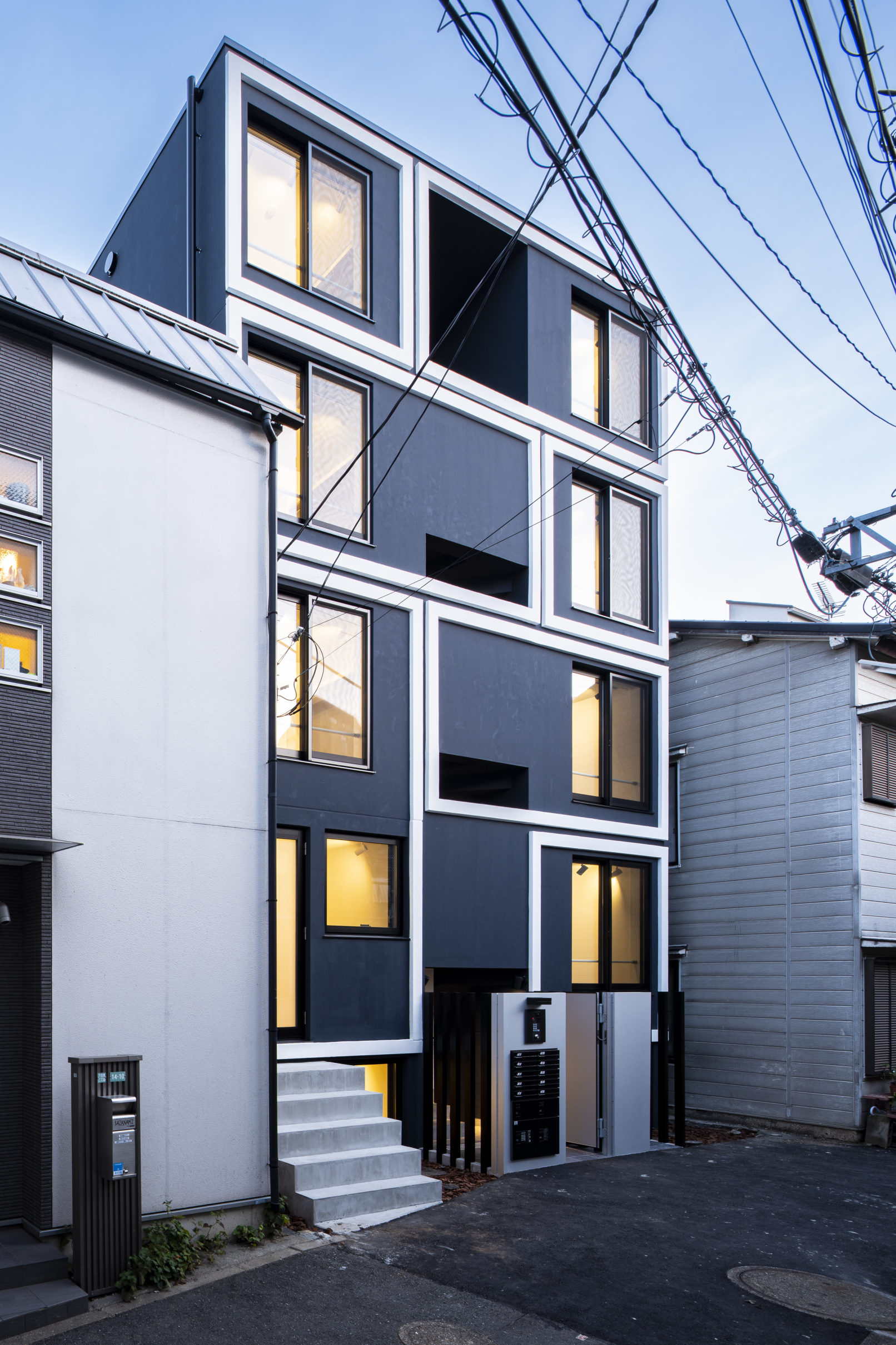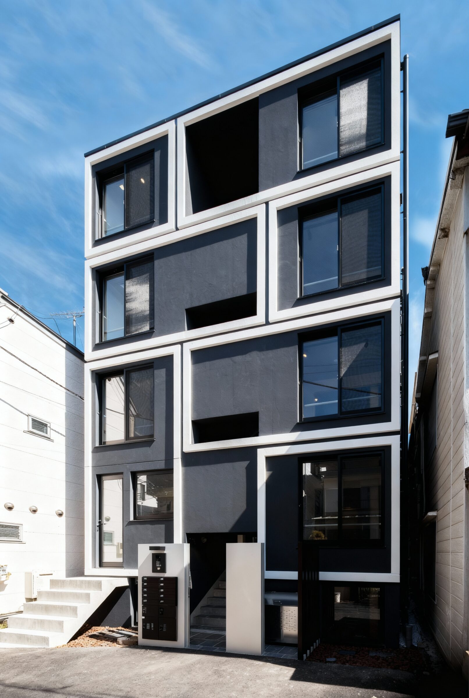 東京都目黒区の住宅街に建つ集合住宅。4m幅員の前面道路、3種高度斜線、日影規制といった厳しい条件の中、地下住戸容積緩和等も使い、160%の容積率を超える10戸の住戸を成立させた。戸建てが建ち並ぶ周辺環境では突出したボリュームとなるが、白のフレーミングにより小さな単位に分割する事で威圧感を和らげ、またそれがモダンな外観を創り出している。高い価値の土地において高密度、高効率な居住を提供すること、また周辺とも差別化出来る内外のデザインによって、数十年後も保ち続けられる建物の価値を創り出していきたいと考えている。