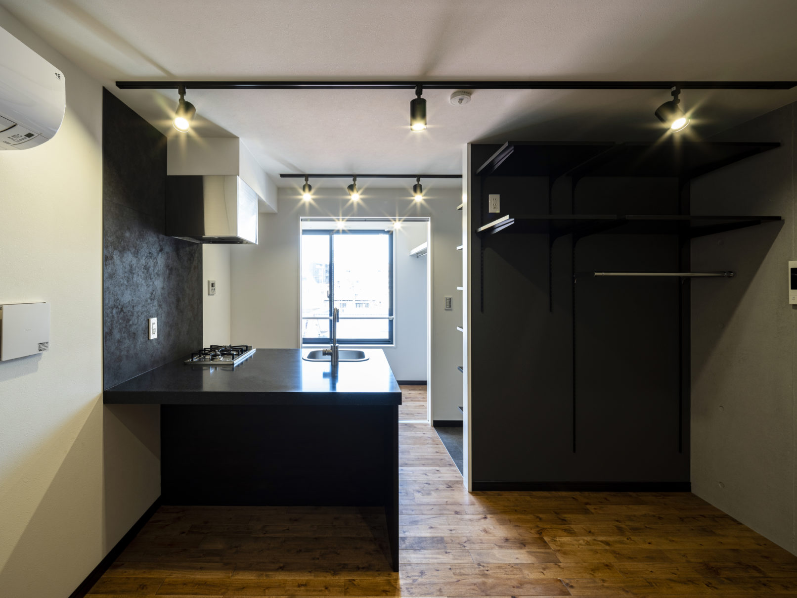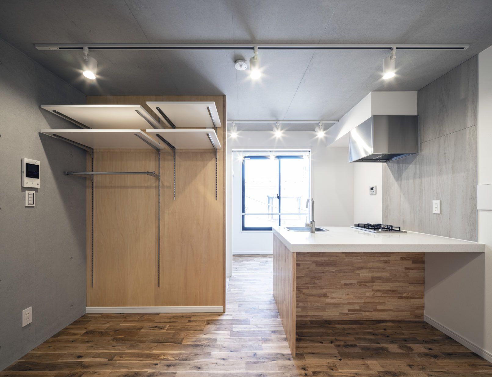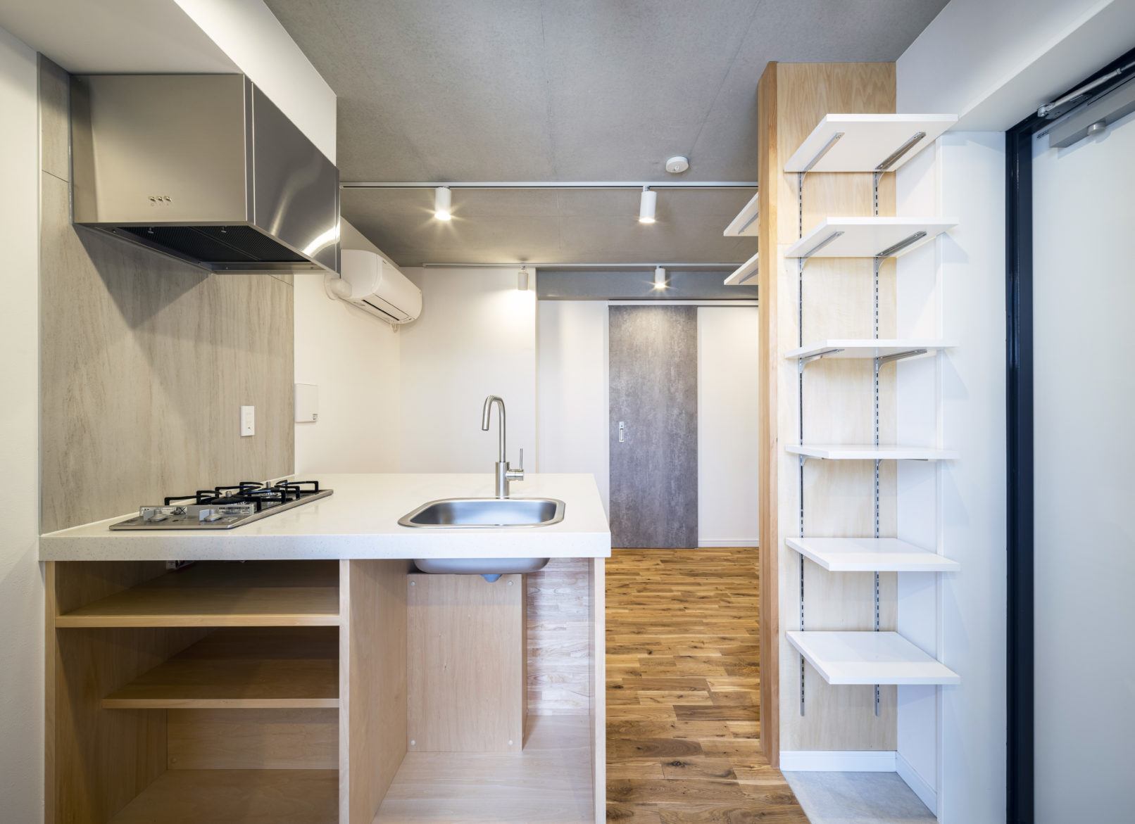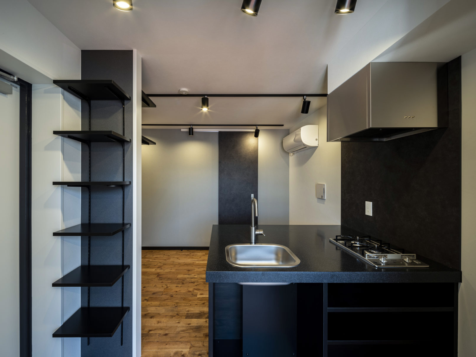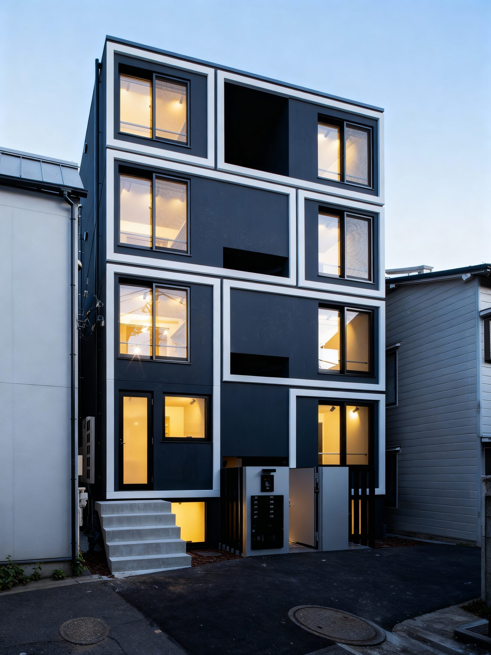 東京都目黒区の住宅街に建つ集合住宅。4m幅員の前面道路、3種高度斜線、日影規制といった厳しい条件の中、地下住戸容積緩和等も使い、160%の容積率を超える10戸の住戸を成立させた。戸建てが建ち並ぶ周辺環境では突出したボリュームとなるが、白のフレーミングにより小さな単位に分割する事で威圧感を和らげ、またそれがモダンな外観を創り出している。高い価値の土地において高密度、高効率な居住を提供すること、また周辺とも差別化出来る内外のデザインによって、数十年後も保ち続けられる建物の価値を創り出していきたいと考えている。