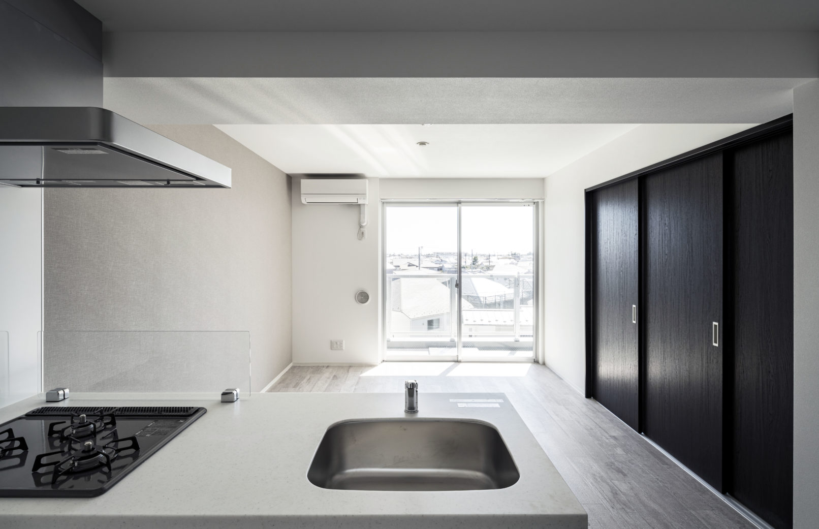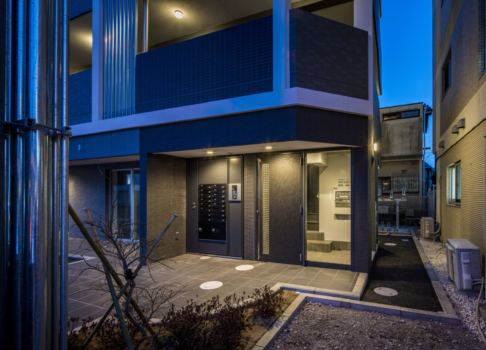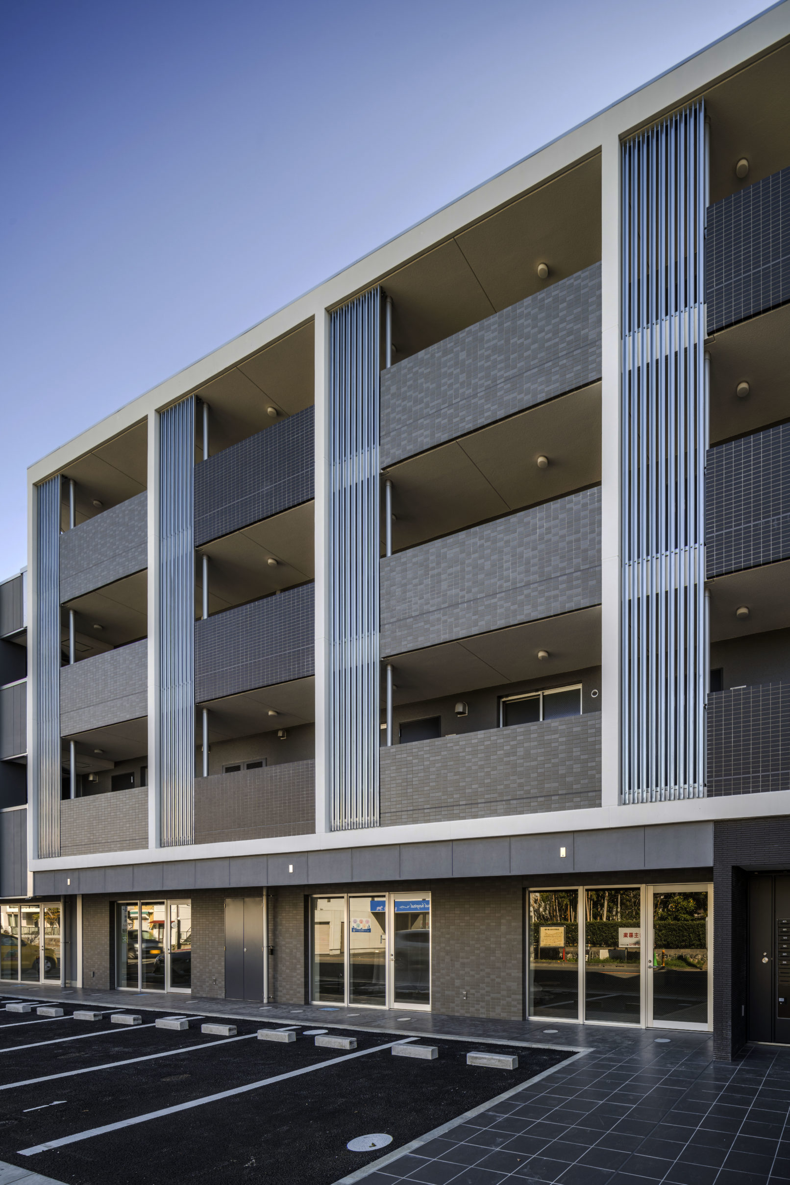 茅ヶ崎市に建つRC+S造の4階建て集合住宅。都市計画道路の関係からこれにかかるボリュームをS造で3層としエキスパンションジョイントでRC棟とつないでいる。ファサードには亜鉛メッキでされたC型チャンネルを素地のままルーバーとして用い、玄関扉前の目隠しとしている。ローコストながら同時にそれがこの建物のファサードを特徴となっている。