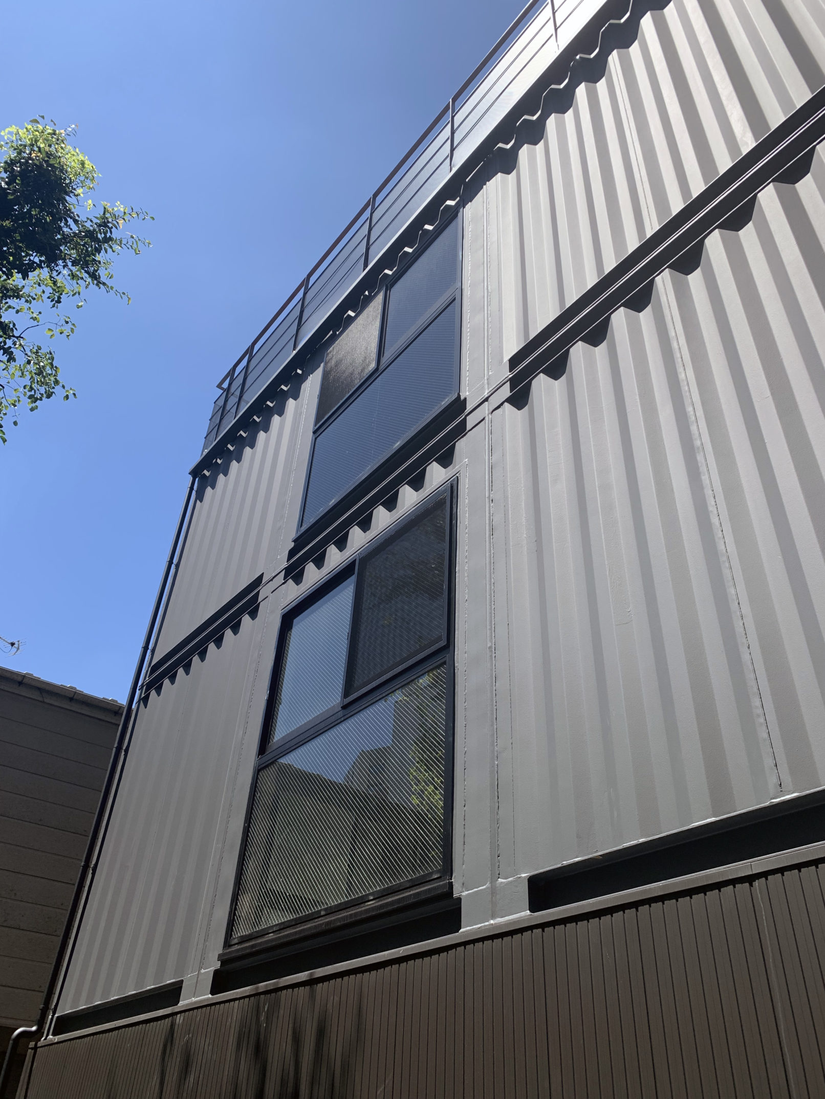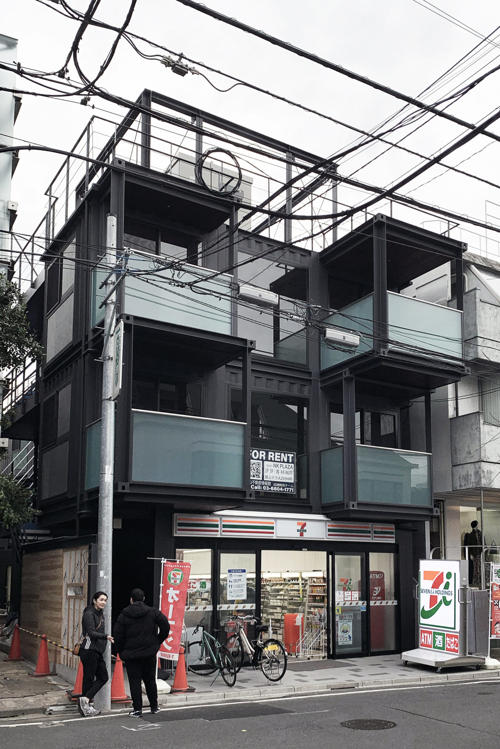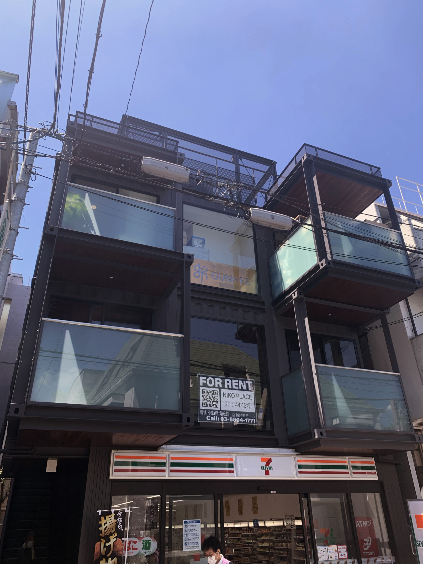 表参道の商業ストリートに建つ、コンテナユニットを使った商業施設。中国大連において20Ftサイズのコンテナを制作しコストと工期の圧縮と工法の刷新を図っている。ファサードは凹凸を設けて積み上げ、上裏の木貼りによりスチールフレームに温かなアクセントを加えた。