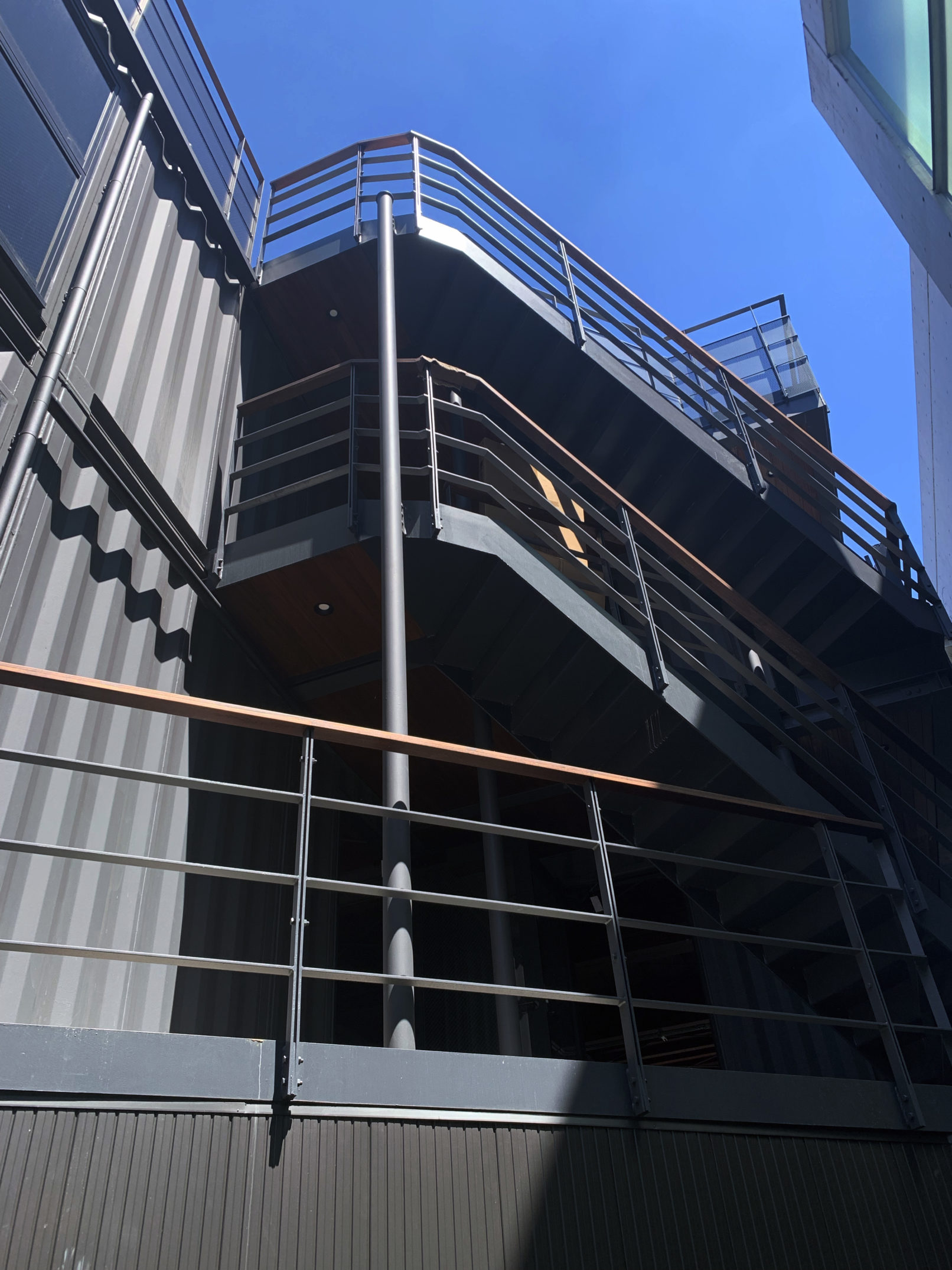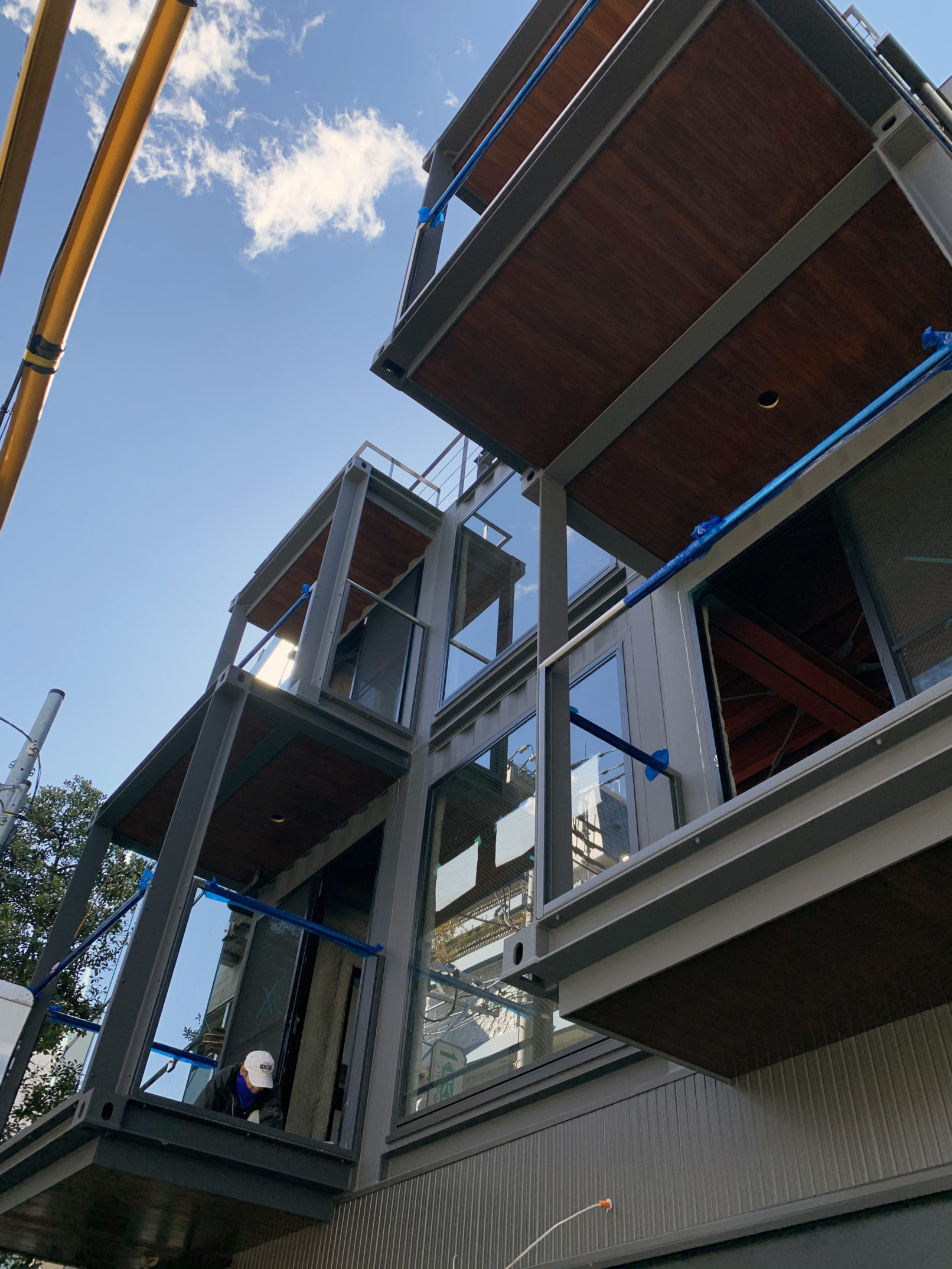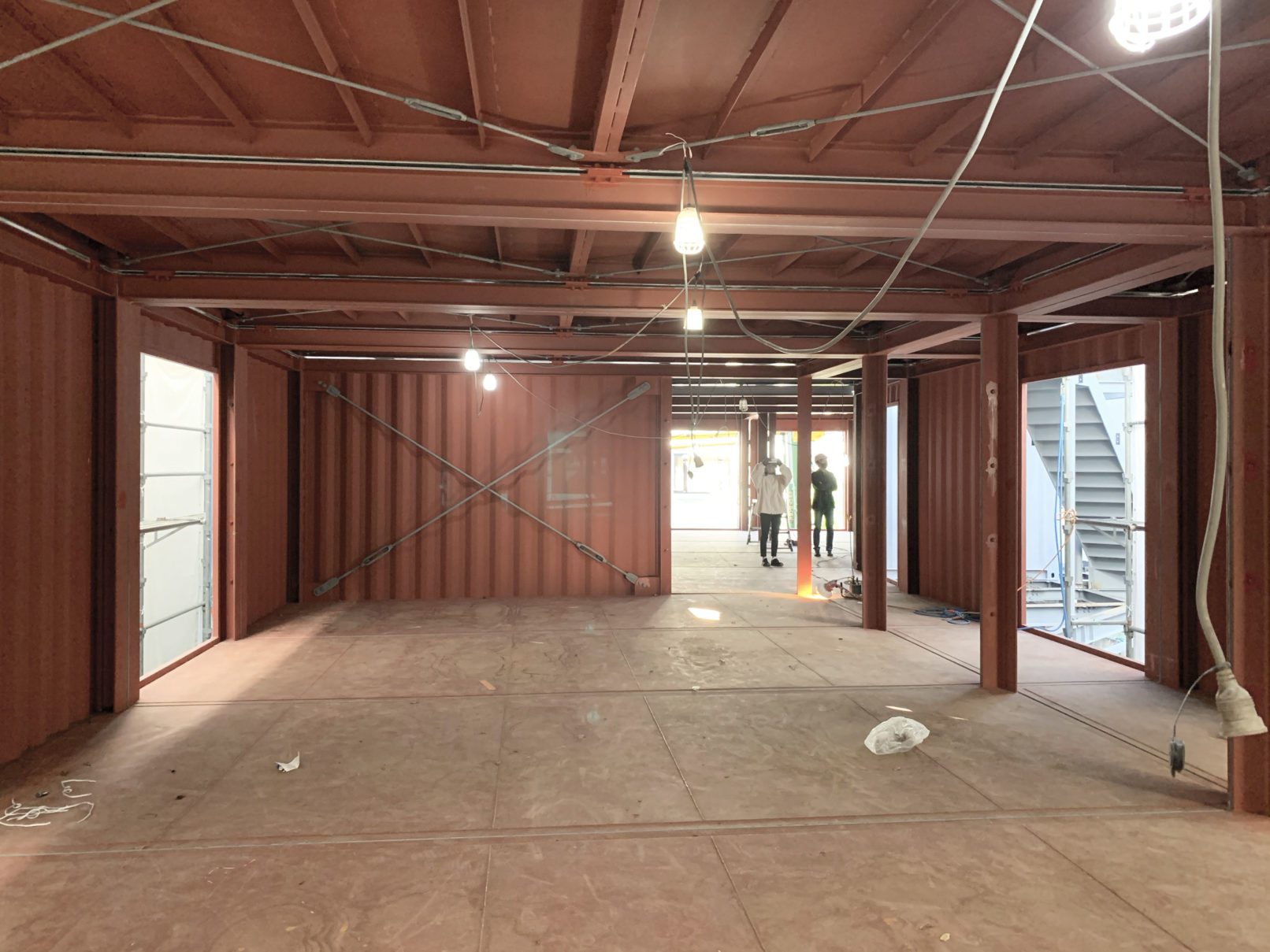 表参道の商業ストリートに建つ、コンテナユニットを使った商業施設。中国大連において20Ftサイズのコンテナを制作しコストと工期の圧縮と工法の刷新を図っている。ファサードは凹凸を設けて積み上げ、上裏の木貼りによりスチールフレームに温かなアクセントを加えた。