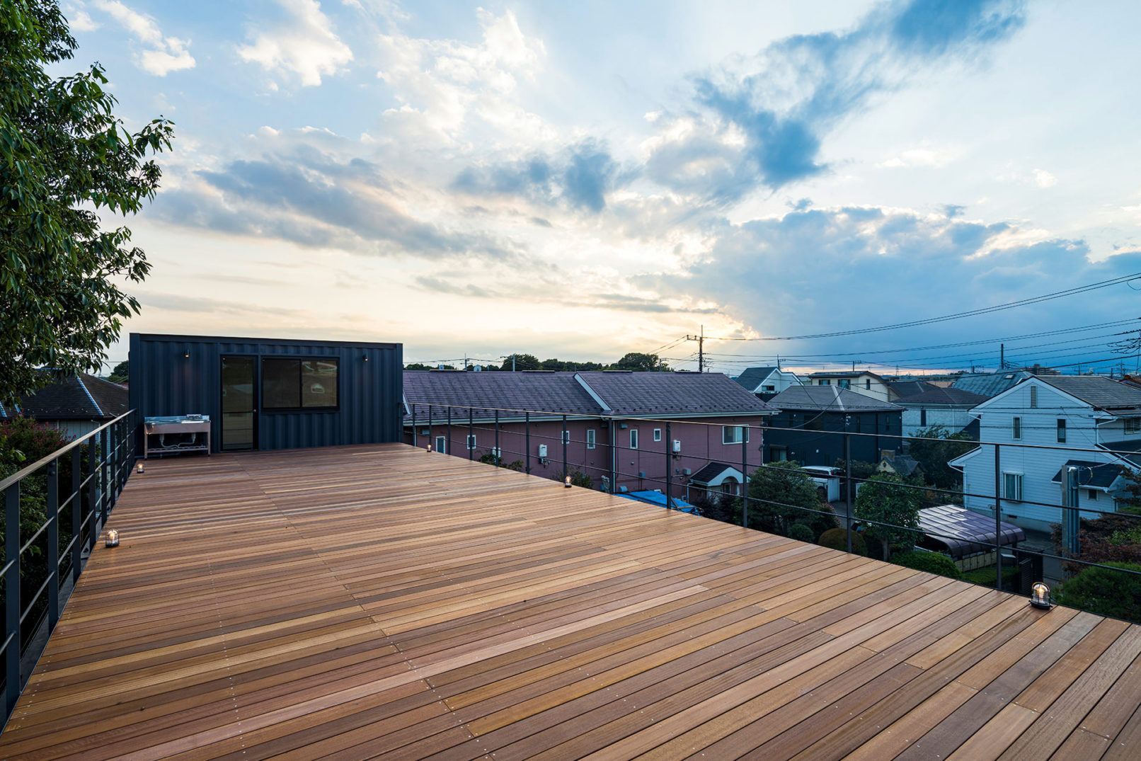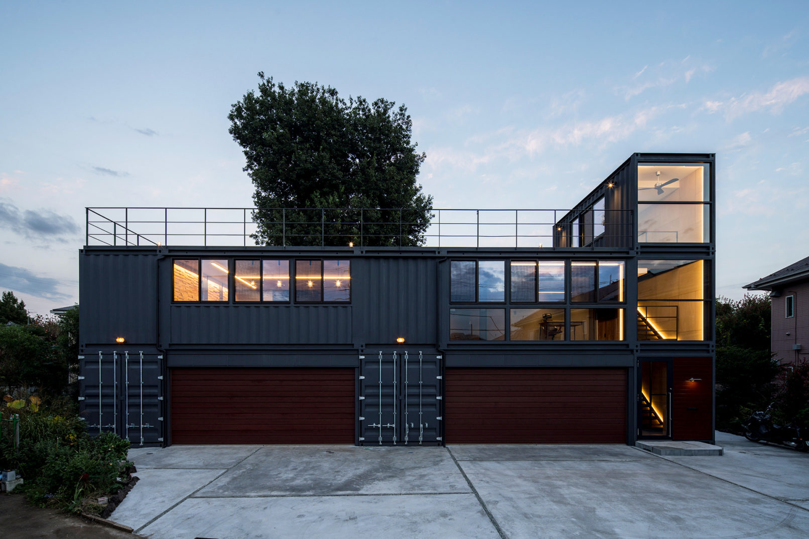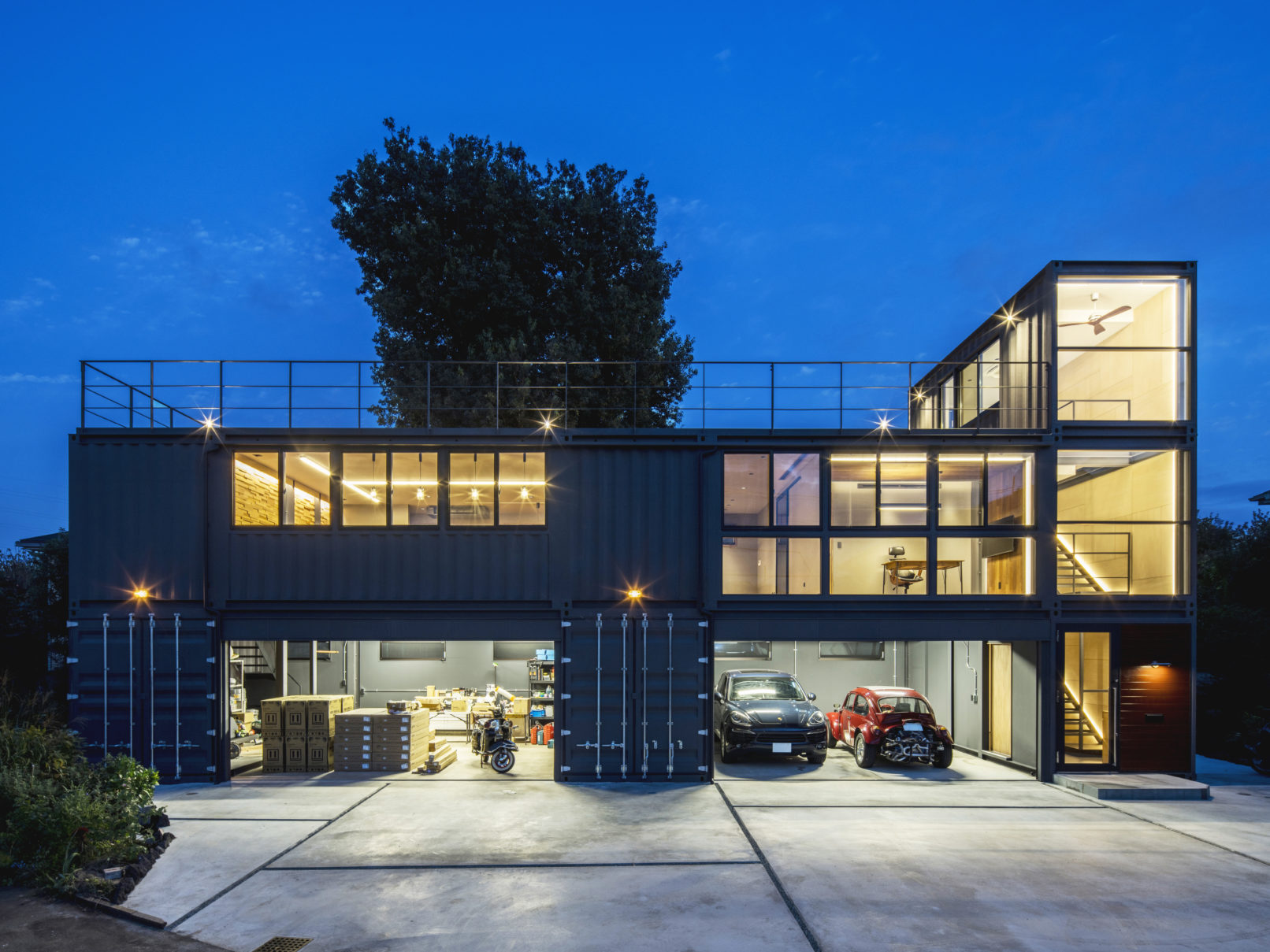 11台の20Ftコンテナユニットによる建築。両端と中央に6台のユニットを配し、その間にユニットを直交させ飛ばして出来た下部をガレージ/工房とした全体構成である。各ユニットは中国の工場にて外壁・屋根までを全溶接したモノコックボディとなっており、現場ではクレーンで積み重ねてボルト接合するのみ、防水工事不要で1日で外壁工程までが完了する。今後は工場での制作部分を増やすことで更なる省工期、省工種、省人工化を実現し、様々な用途の建築へと展開をしていきたいと考えている。