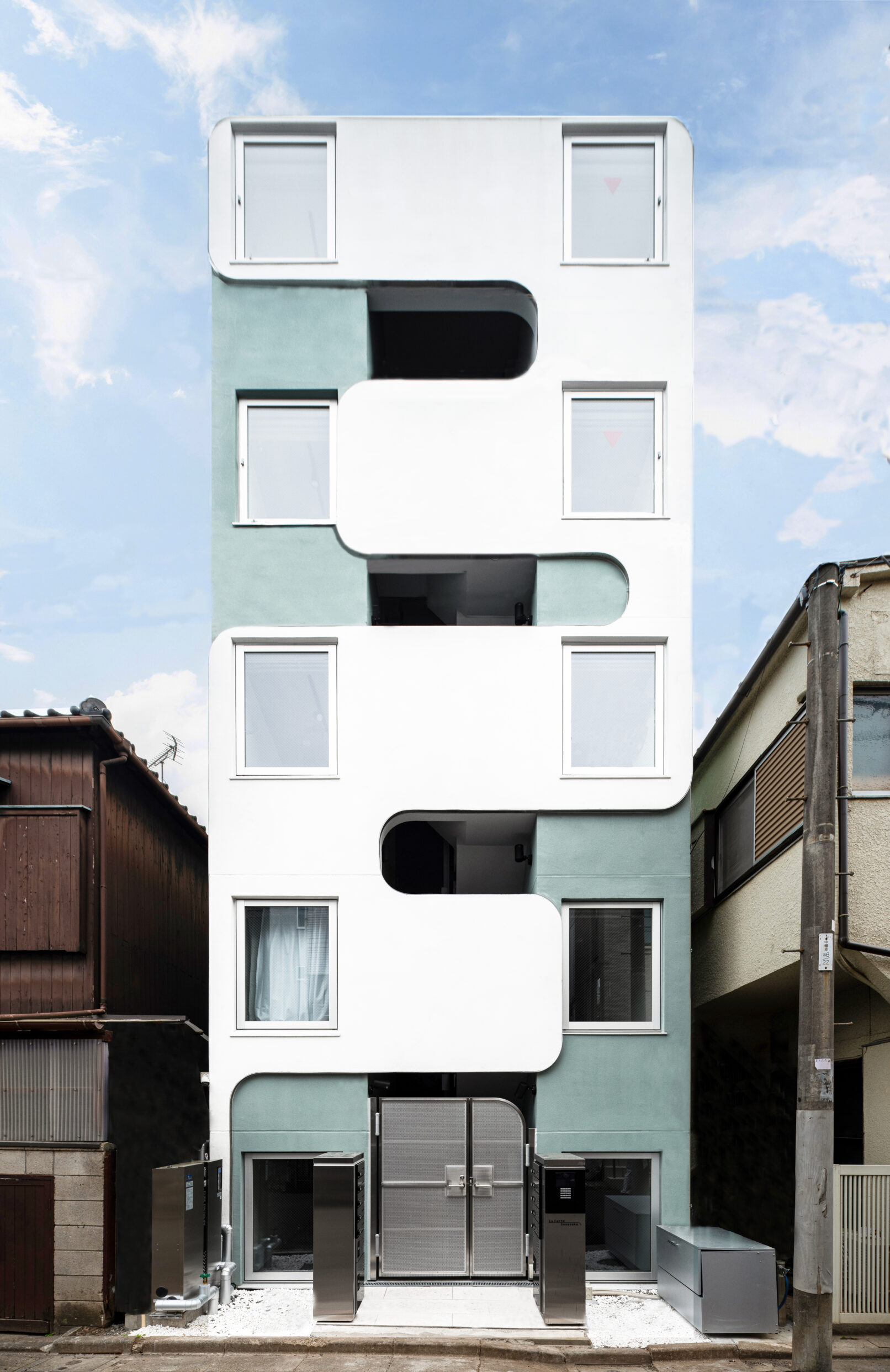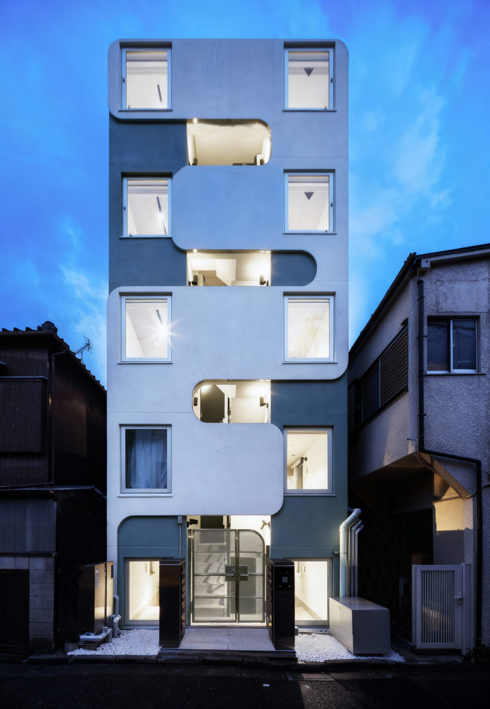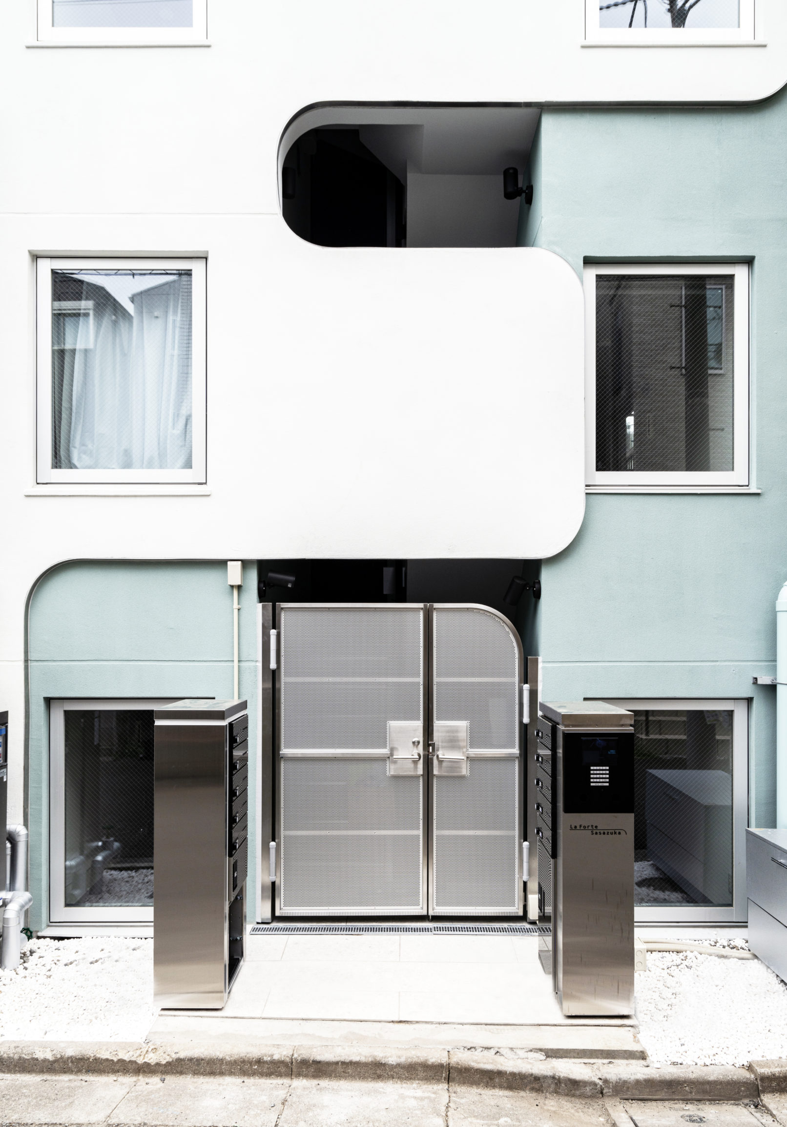 東京都渋谷区の住宅街に建つ集合住宅。15坪弱の戸建て用地において、階段室型2戸1の10戸の住宅を集合させた。1戸14㎡ほどの住戸はベッドスペースや洗濯機などを備えられたホテル的なミニマル都市的居住である。水平垂直で構成されがちな集合住宅において、女性的な配色や曲線によりファサードを構成する事によって柔らかい印象ながら周囲から突出し街並みに刺激を与える存在となっている。