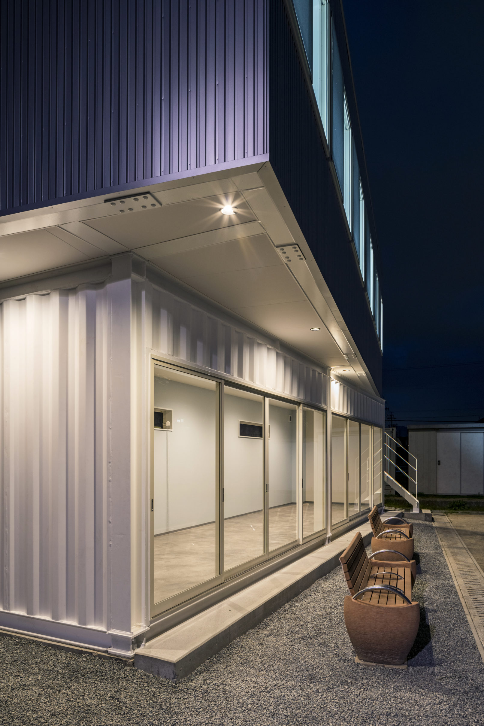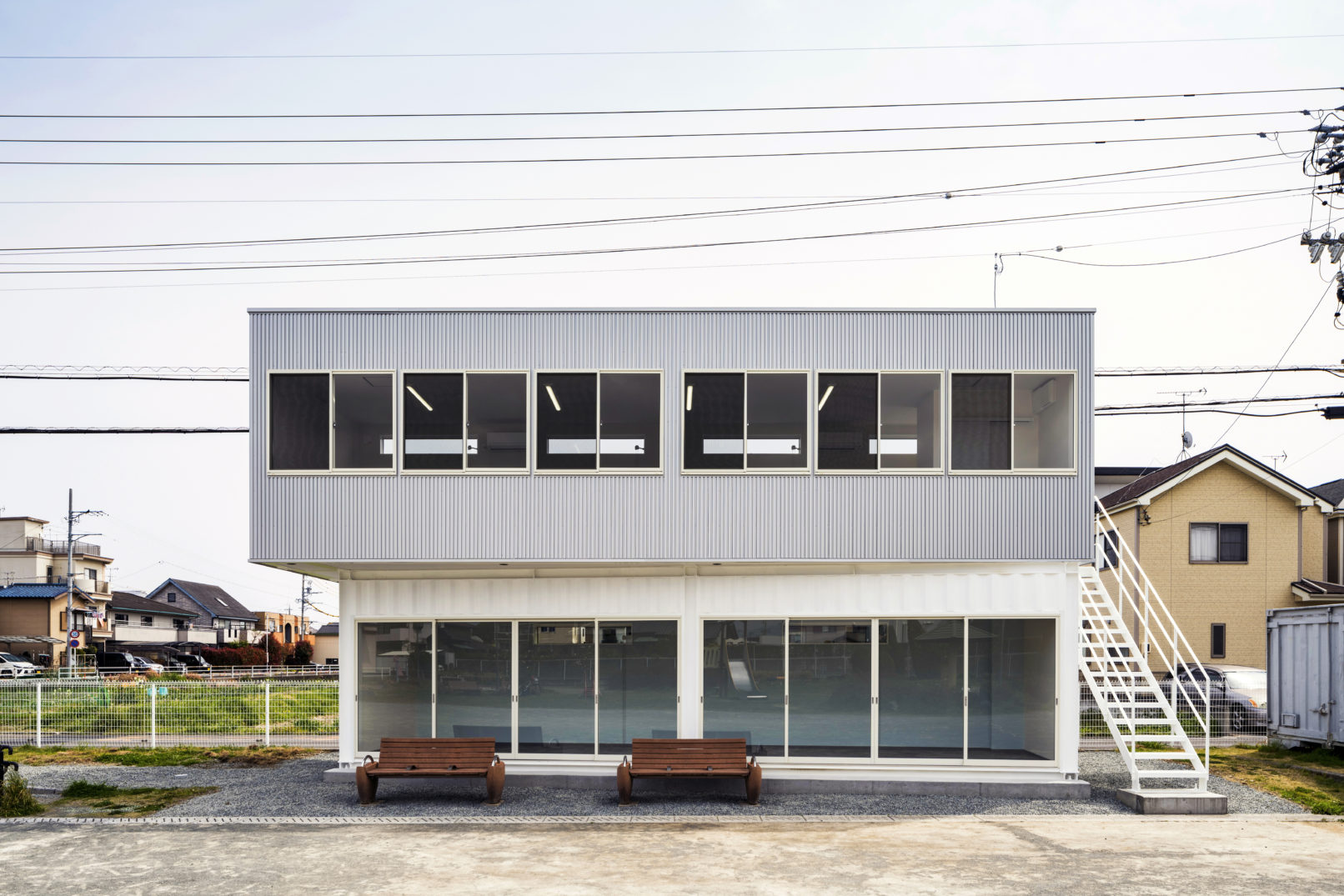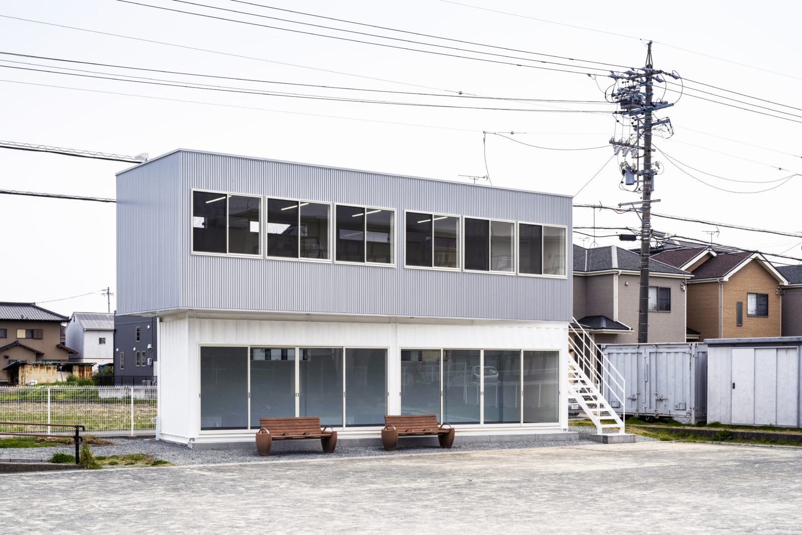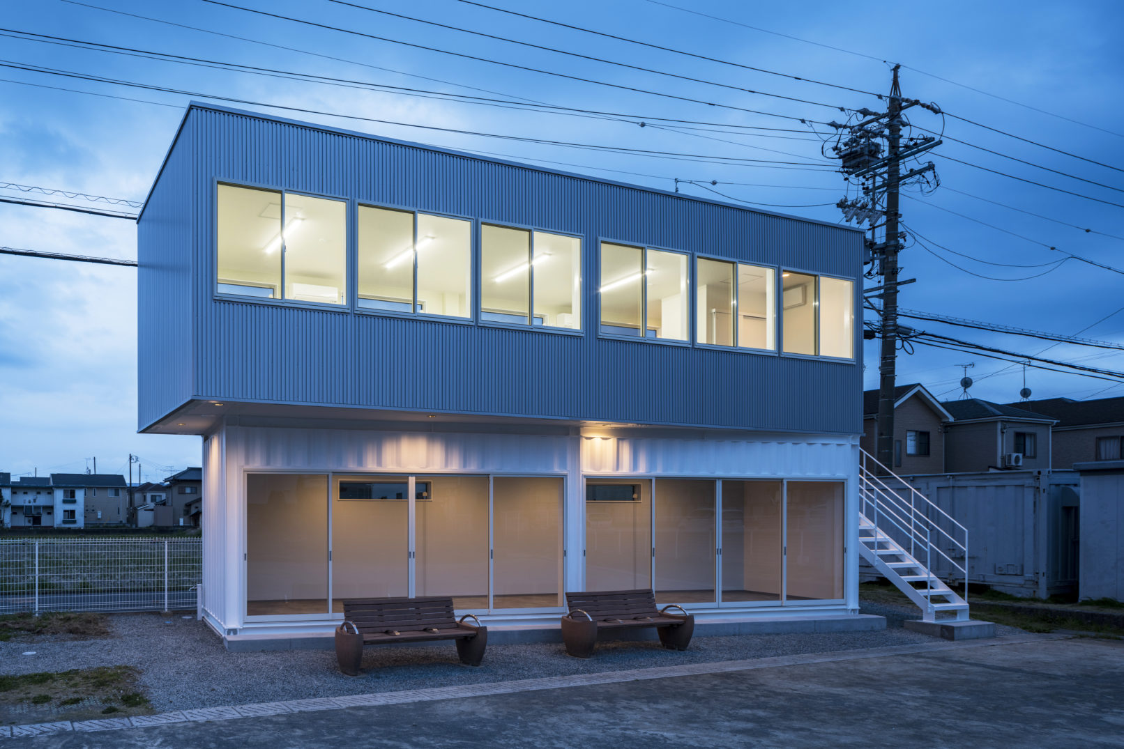 静岡県駿河市の公園内に建つ、1階が公園の一部である休憩施設、2階が市民のための集会施設。一階をコンテナユニット、二階は公園内に許された建ぺい率をいっぱいに使うべく在来鉄骨造とた。コンテナ建築は規格化が醍醐味であるが、このようにハイブリッドとする事で、敷地の制約や要件に柔軟に対応する事も可能である。2つの箱を積み木のように無造作に重ねたように見せるディテールにこだわった。1階サッシは大きく開け放ち公園と連続でき、子供たちが元気に駆け回る市民に親しまれる施設になることを期待している。