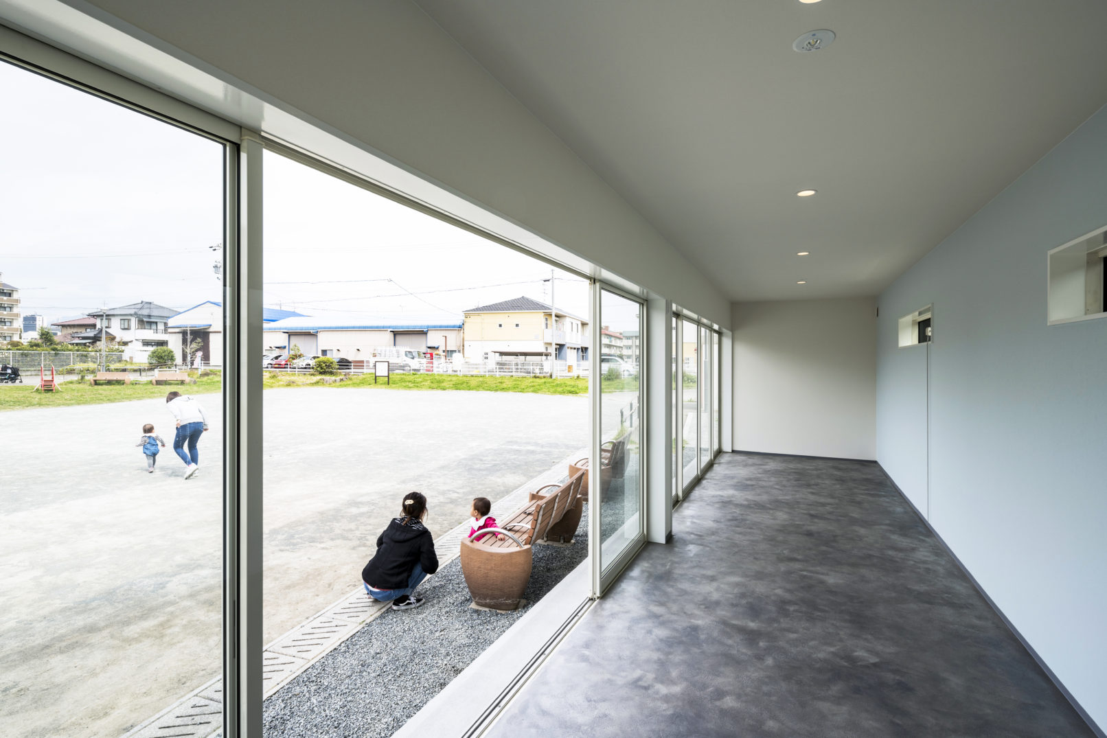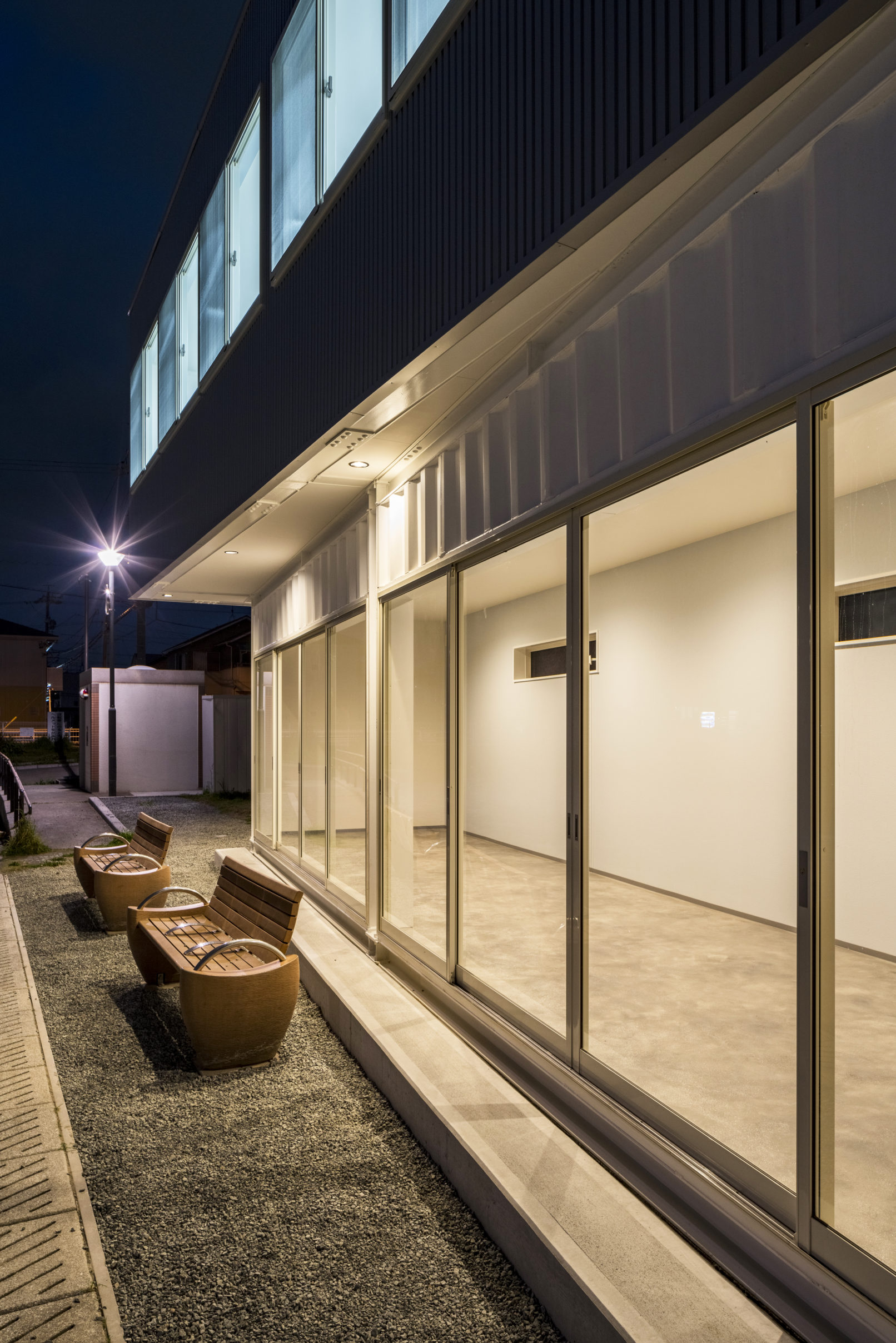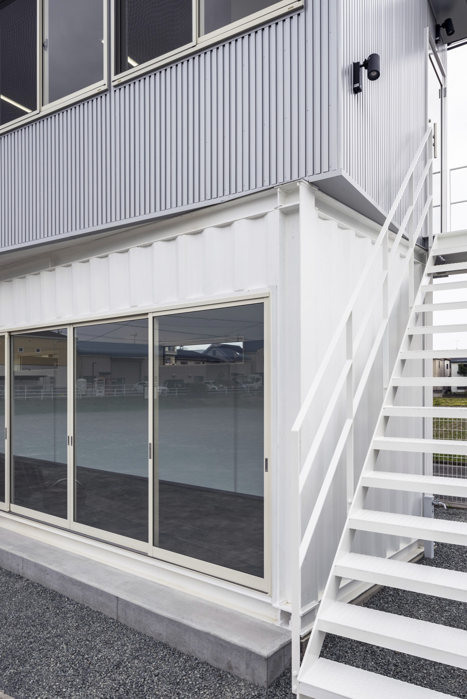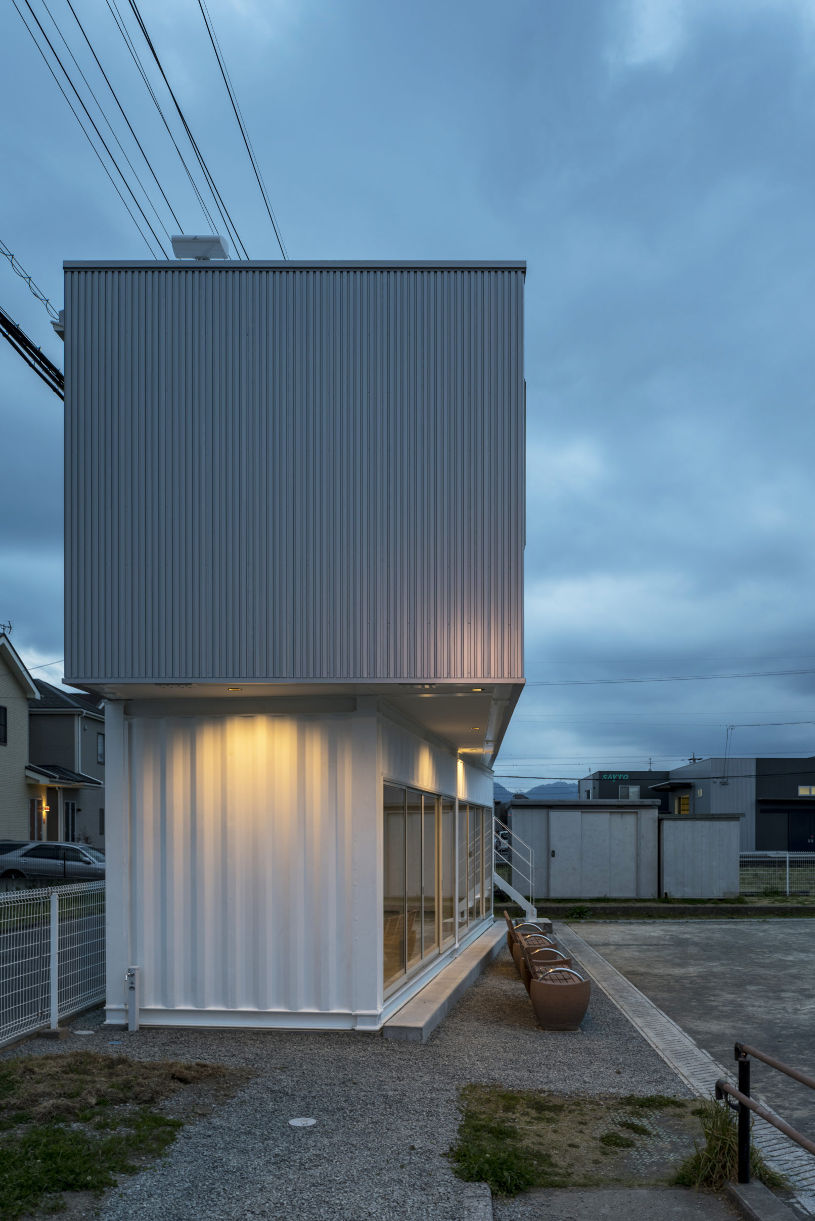 静岡県駿河市の公園内に建つ、1階が公園の一部である休憩施設、2階が市民のための集会施設。一階をコンテナユニット、二階は公園内に許された建ぺい率をいっぱいに使うべく在来鉄骨造とた。コンテナ建築は規格化が醍醐味であるが、このようにハイブリッドとする事で、敷地の制約や要件に柔軟に対応する事も可能である。2つの箱を積み木のように無造作に重ねたように見せるディテールにこだわった。1階サッシは大きく開け放ち公園と連続でき、子供たちが元気に駆け回る市民に親しまれる施設になることを期待している。
