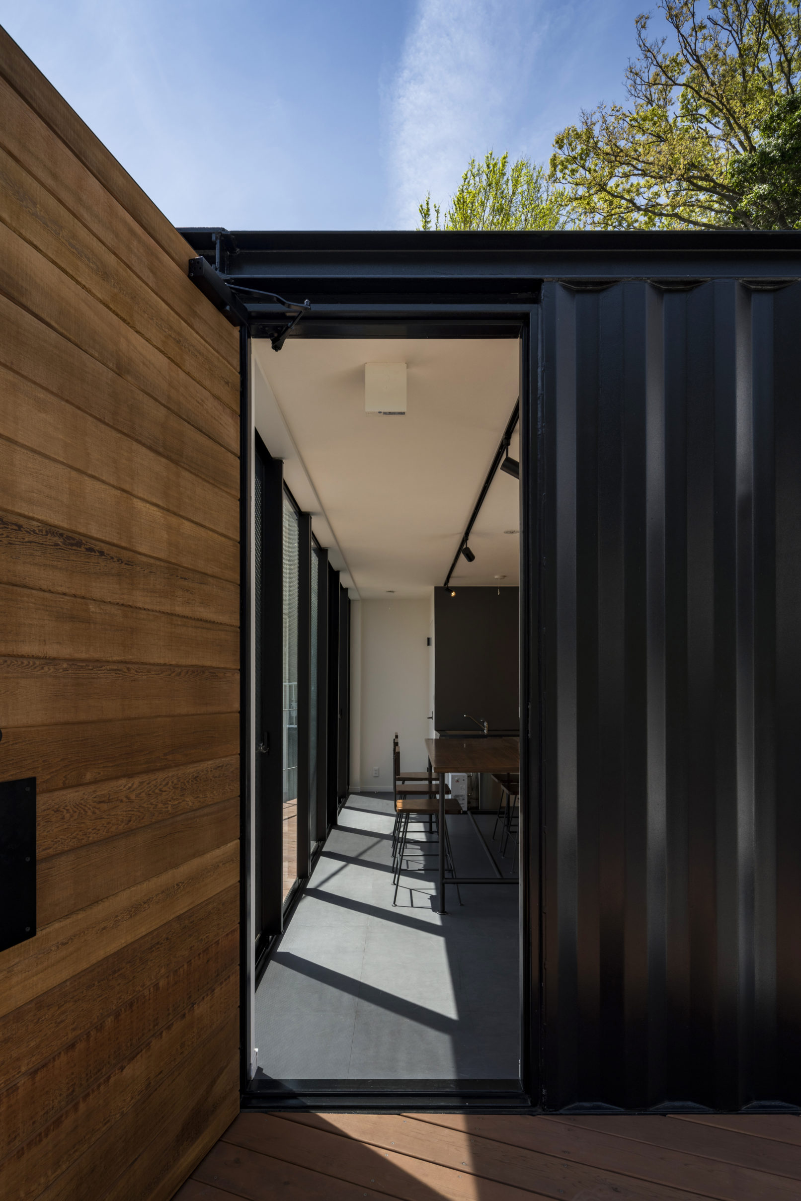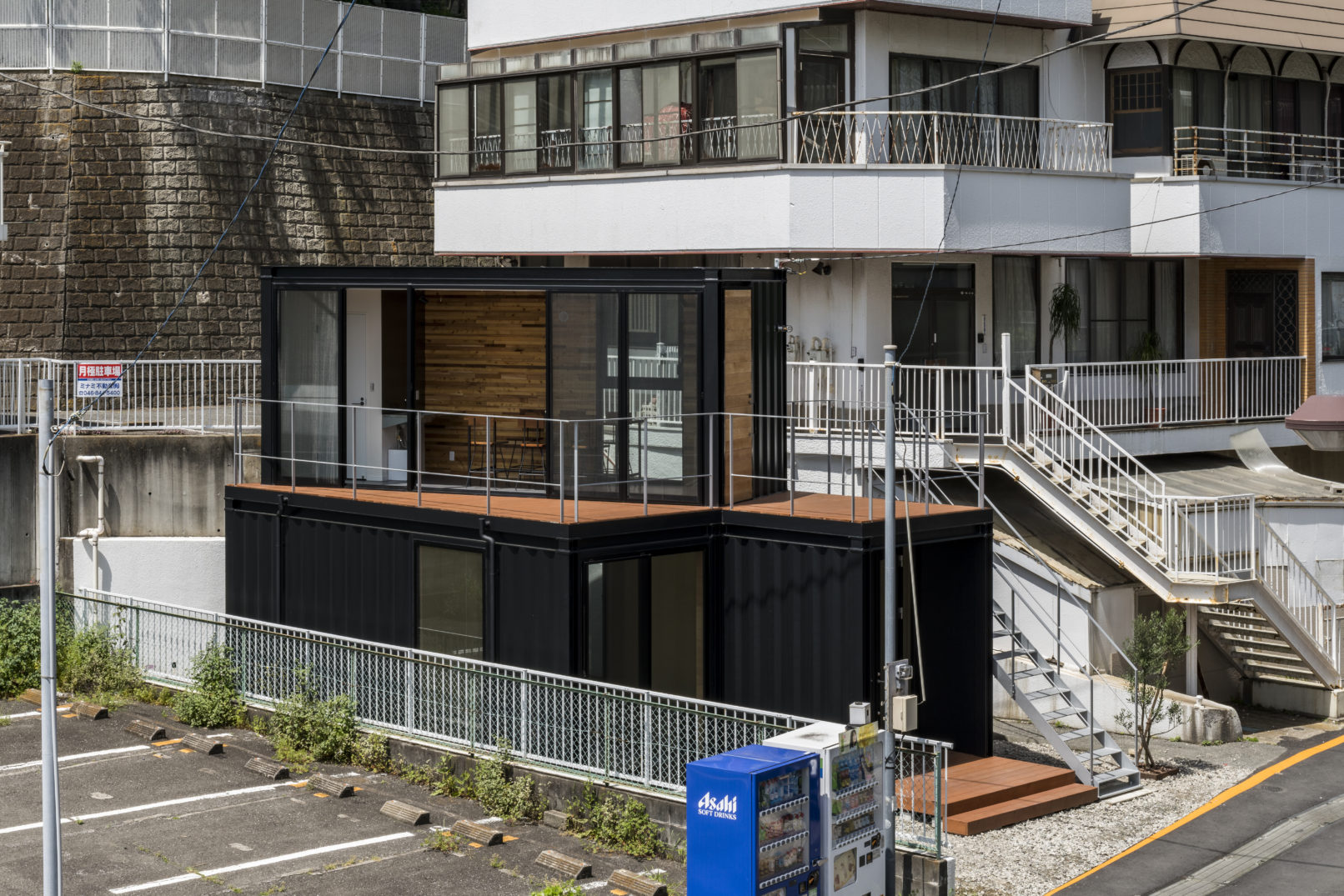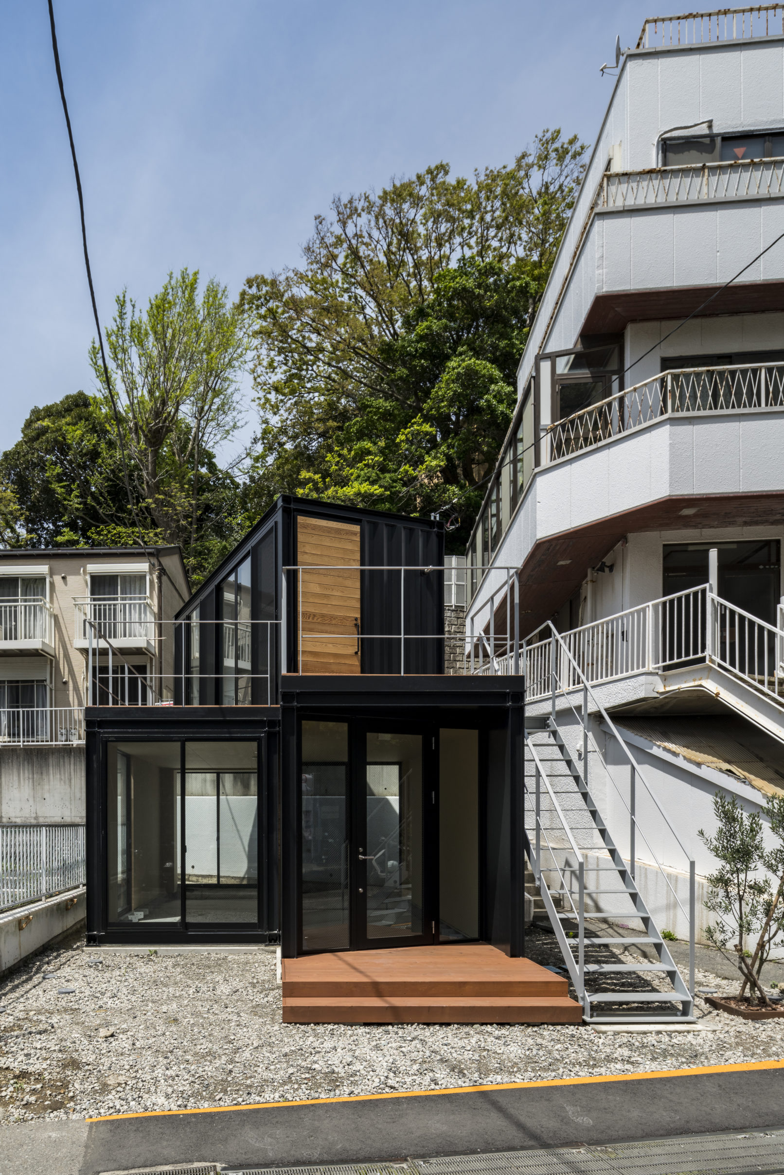 横須賀市浦賀に建つコンテナユニット建築。1Fがテナントで2Fがショールーム。20Ftサイズのコンテナを1階に2台、2階に1台を斜めに振って配置することで三角形の眺望の良いテラスをつくりだした。浦賀といえばペリーの黒船という事で、マットな真っ黒の鉄の外壁とし、そこに表情のある木材で対比的なマッチングをもたらした。ユニット化して内部まで作り込み現地に運ぶことによって、革命的な工期の短縮をもたらし、職人不足の建設業界に一石を投じる工法を目指している。