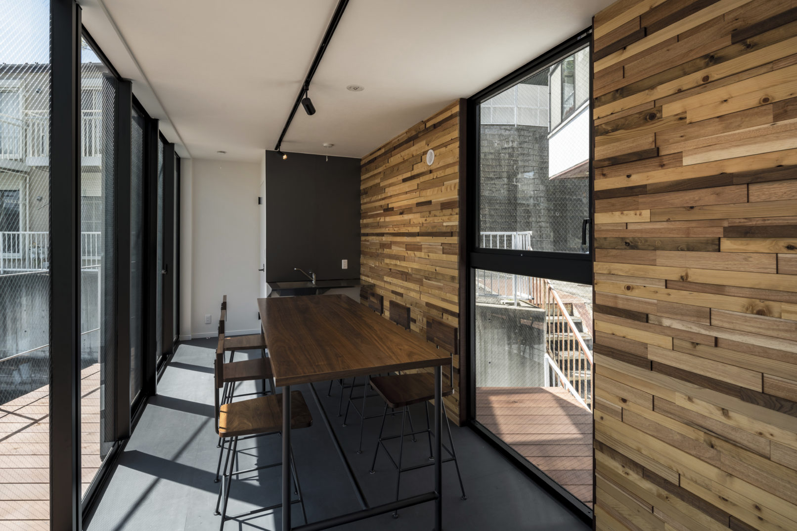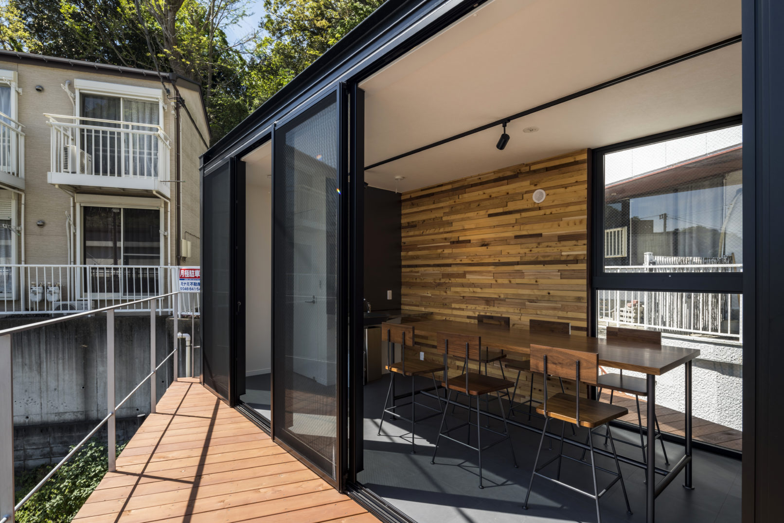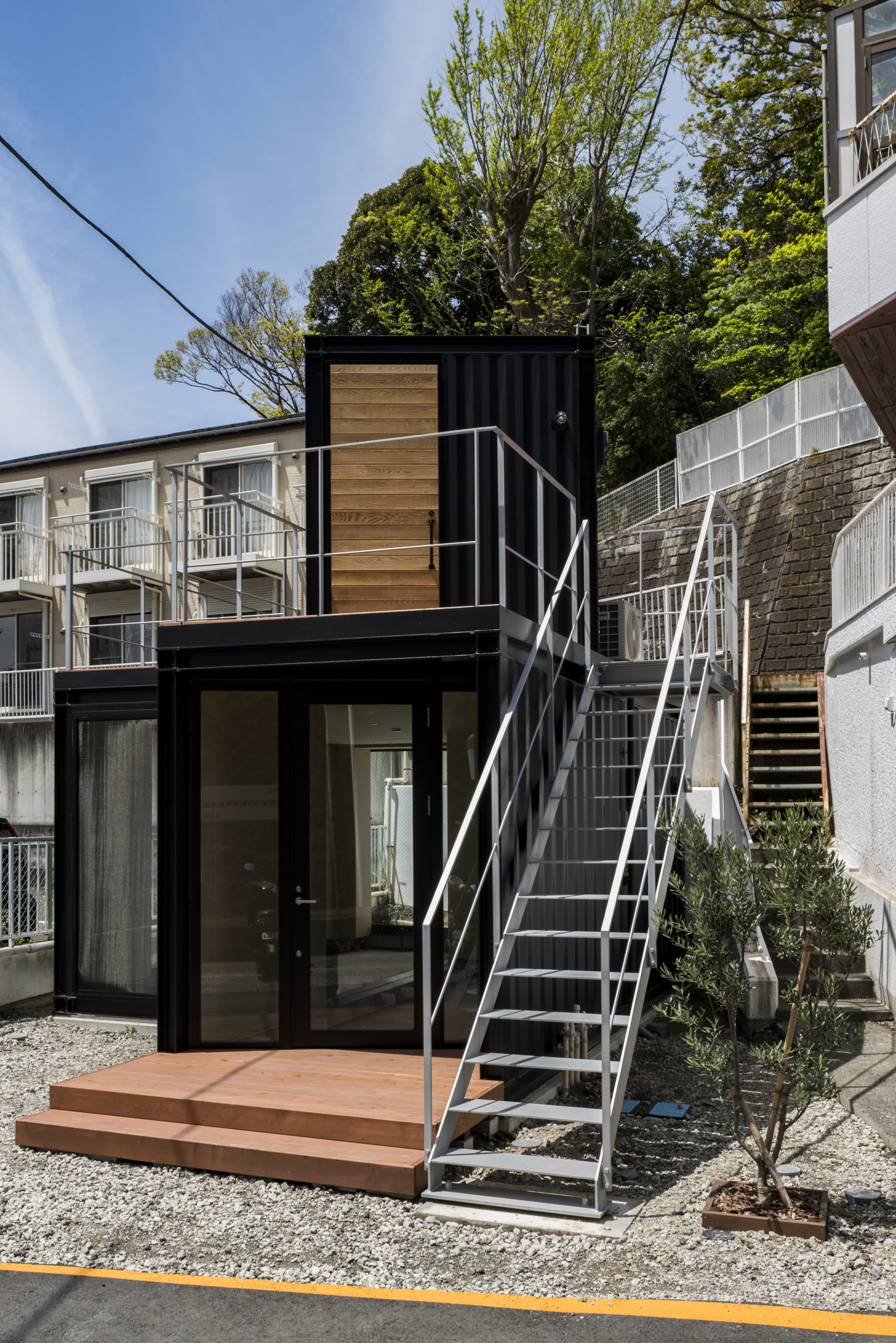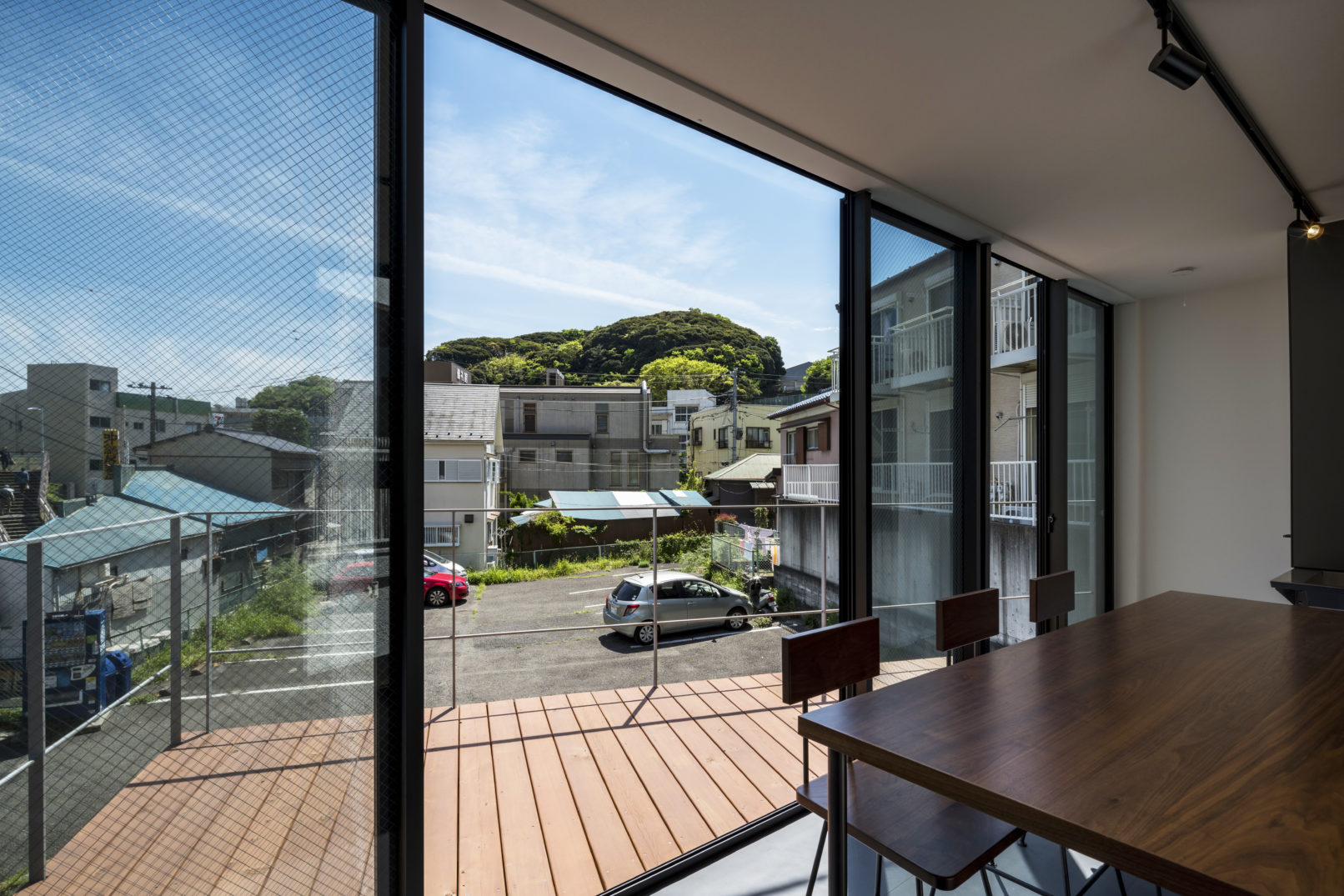 横須賀市浦賀に建つコンテナユニット建築。1Fがテナントで2Fがショールーム。20Ftサイズのコンテナを1階に2台、2階に1台を斜めに振って配置することで三角形の眺望の良いテラスをつくりだした。浦賀といえばペリーの黒船という事で、マットな真っ黒の鉄の外壁とし、そこに表情のある木材で対比的なマッチングをもたらした。ユニット化して内部まで作り込み現地に運ぶことによって、革命的な工期の短縮をもたらし、職人不足の建設業界に一石を投じる工法を目指している。