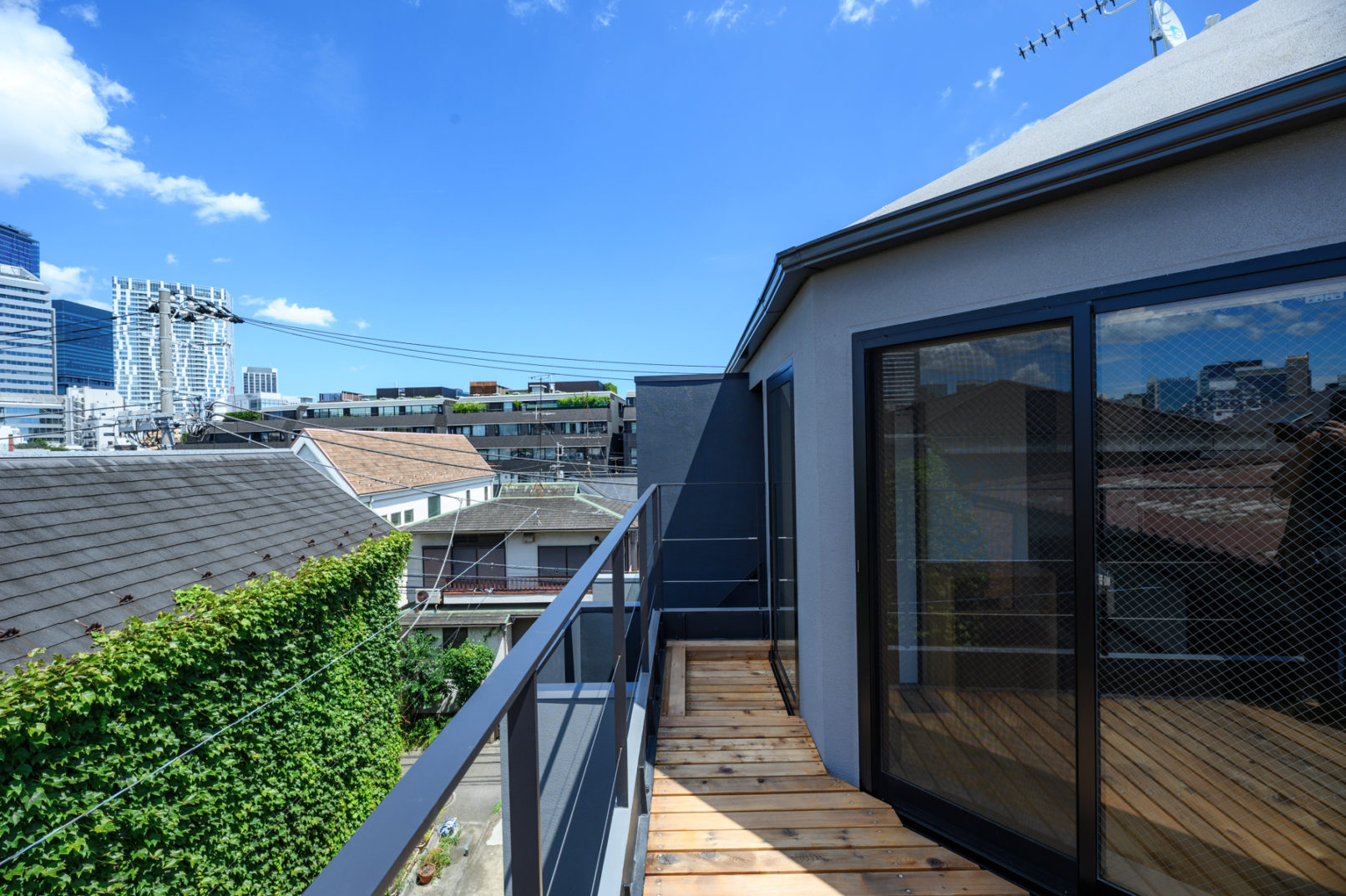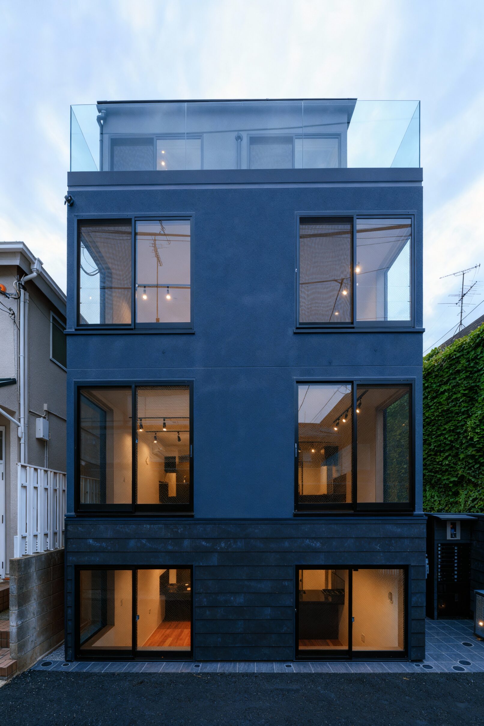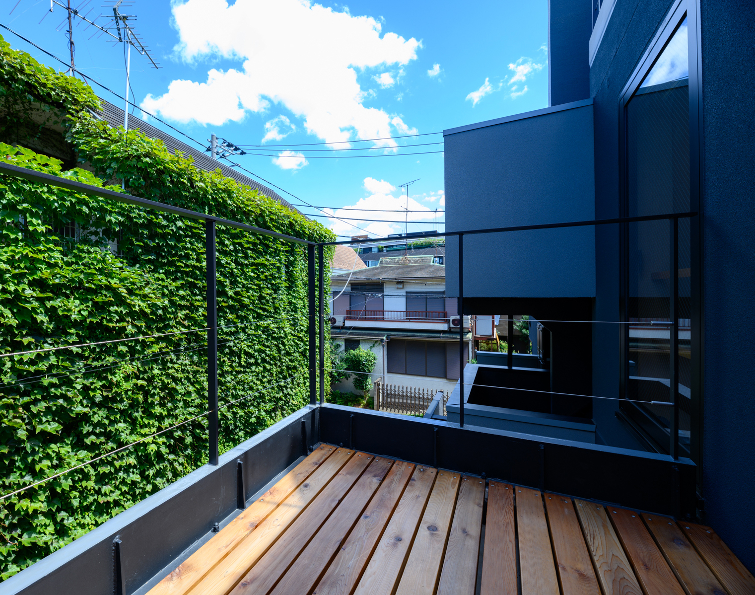 渋谷区鉢山町に建つ地下1階地上3階の集合住宅。第一種低層住居専用地域で高度斜線や日影規制により生じるセットバックや斜め屋根をバルコニー空間や室内空間に積極的に活かした。基壇部はアプローチには下見板貼りとした質感あるタイル貼りとすることで、高級住宅地に似つかわしいシックなスタイルの外観とした。隣の敷地の緑化壁も借景として室内に取り込めるような窓配置としている。