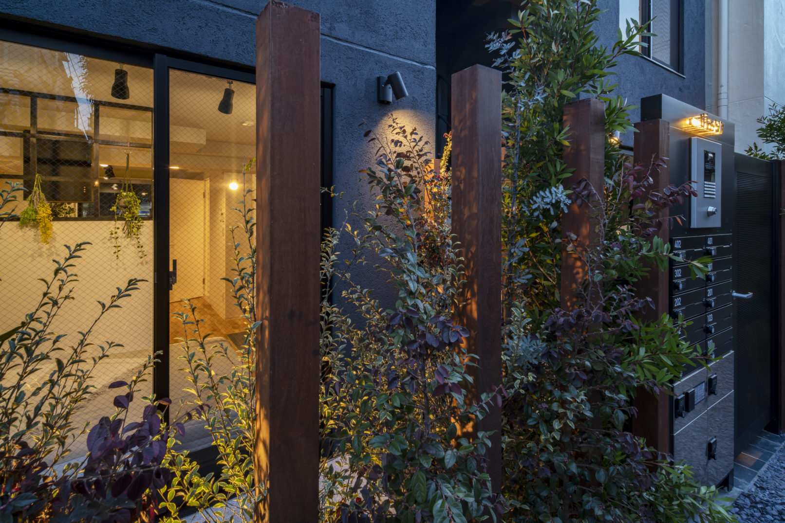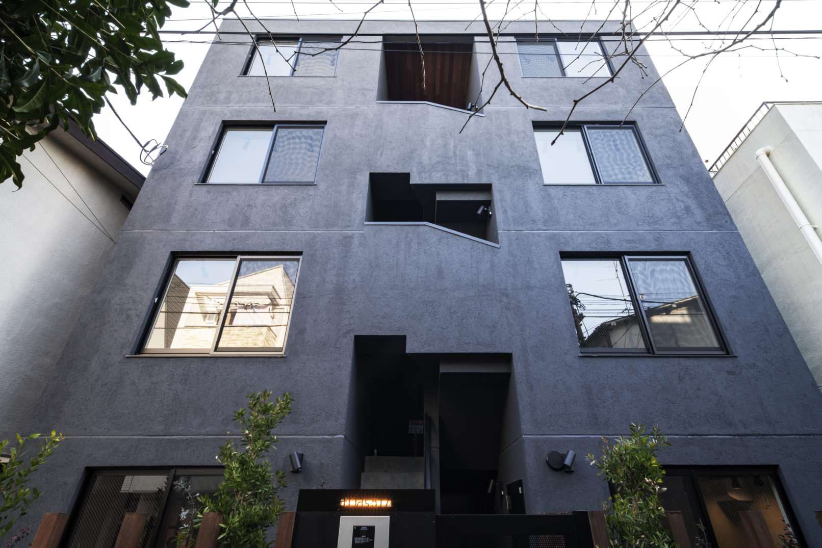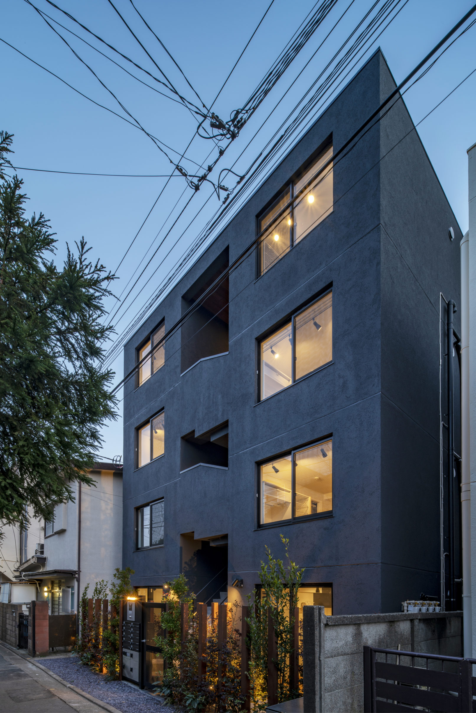 4層を10Mに抑えた都市型RC集合住宅のプロトタイプ。広尾と同様のシリーズであるが、こちらは整形な土地に整形な2戸1の階段室形式の建物とし、1LDK25㎡8戸で構成されている。濃灰の外壁に黒い金属や木の質感のマッチングをデザインコードとして都内への展開を図っていく。